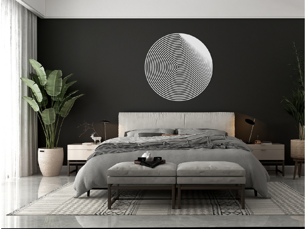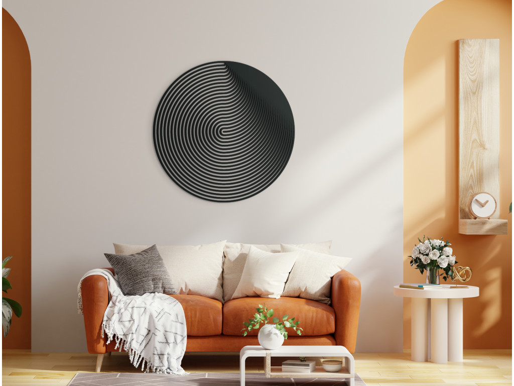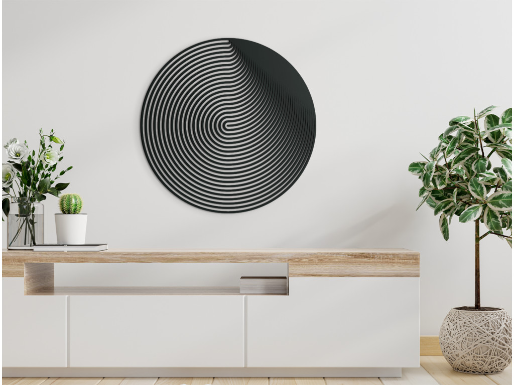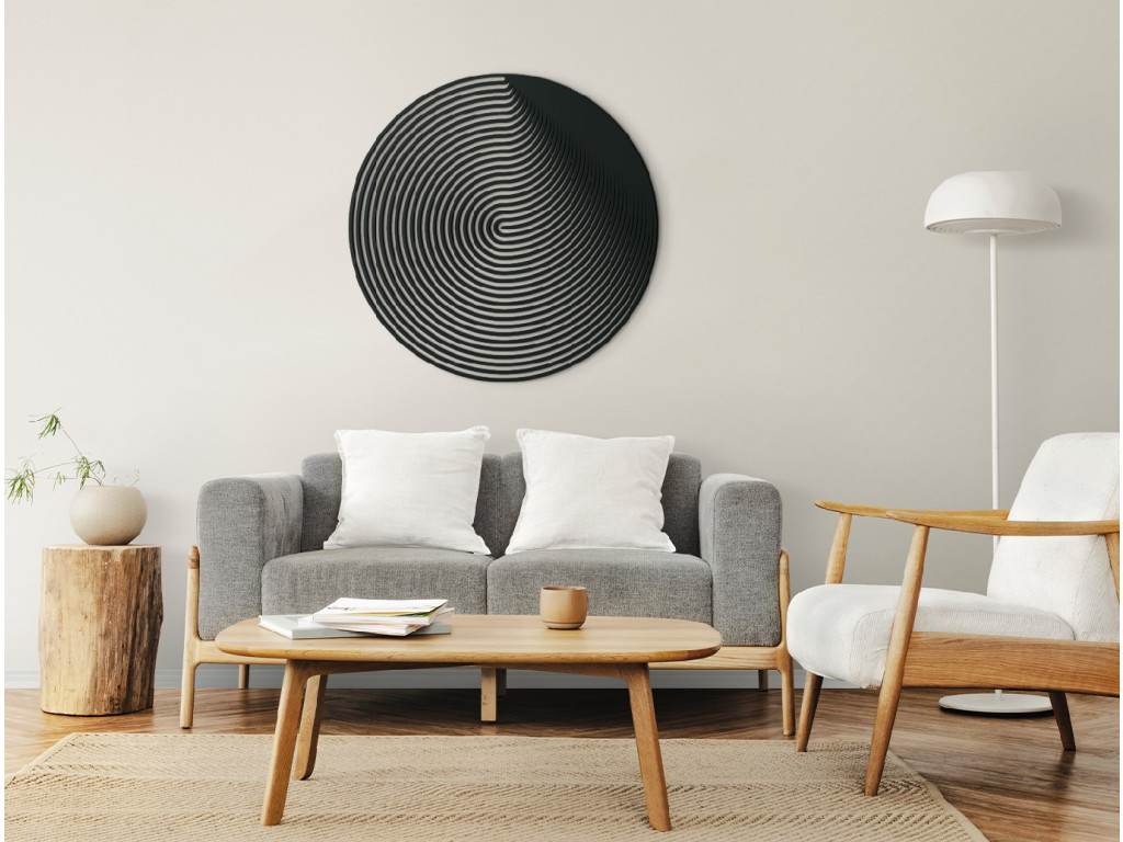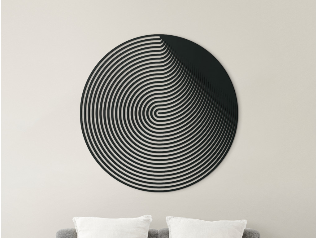 Optické ilúzie fascinujú ľudí na celom svete. Podobne pôsobí aj drevená dekorácia na stenu Abstraktný gong s motívom kruhu vyplneného súborom zakrivených čiar. Ak teda chcete dodať svojej spálni, kancelárii či obývačke neopozeraný vzhľad, iluzionistická dekorácia na stenu vám k tomu určite dopomôže.