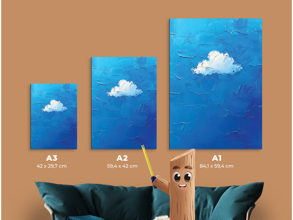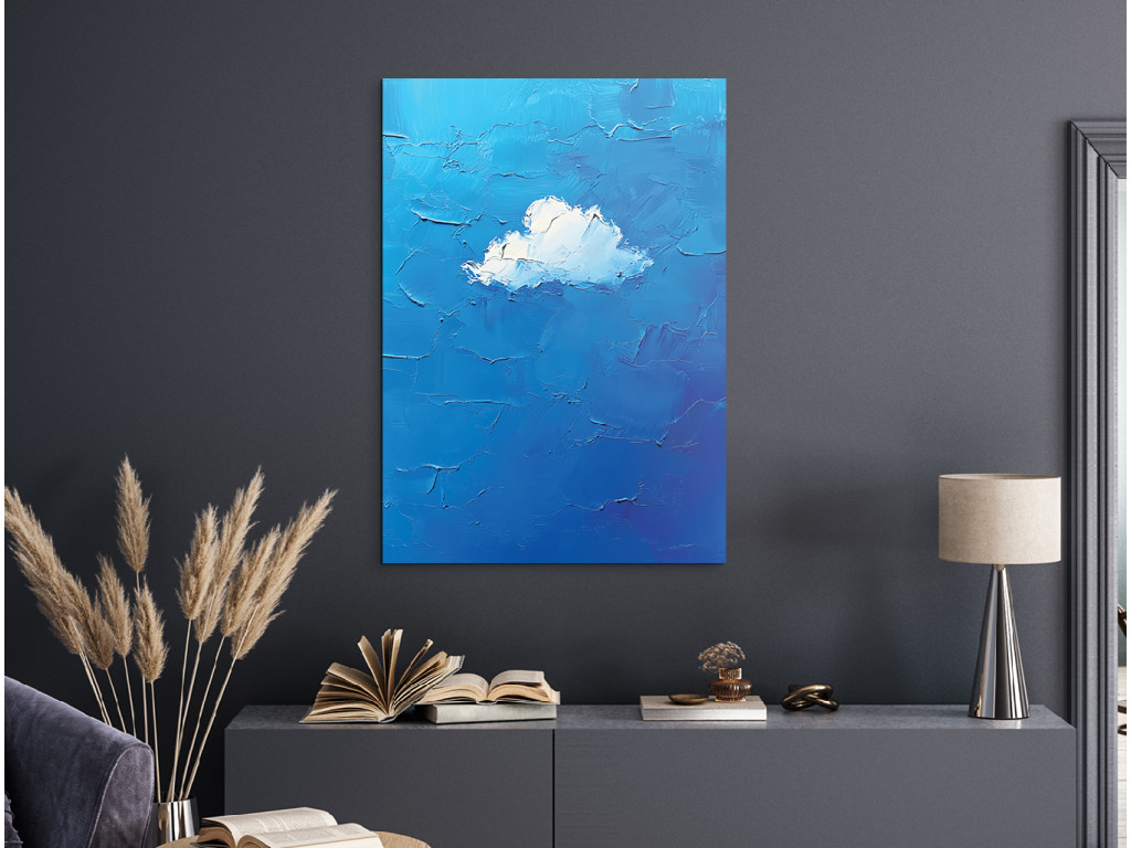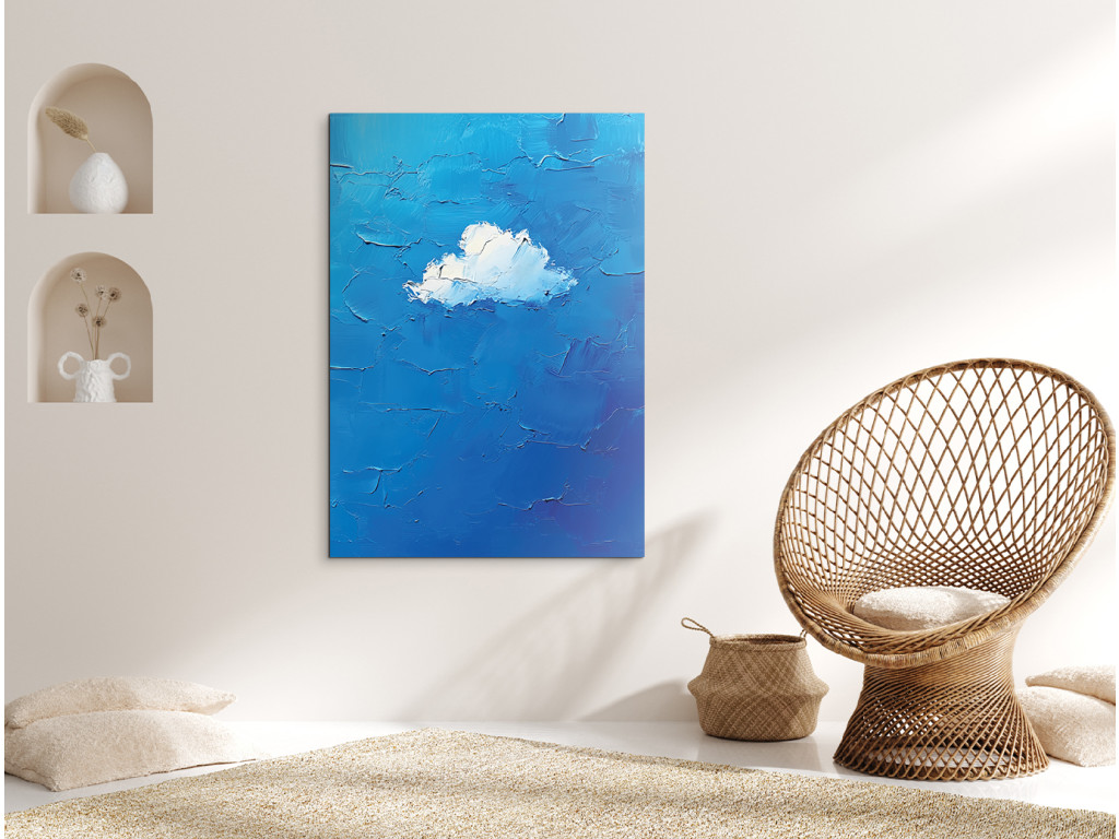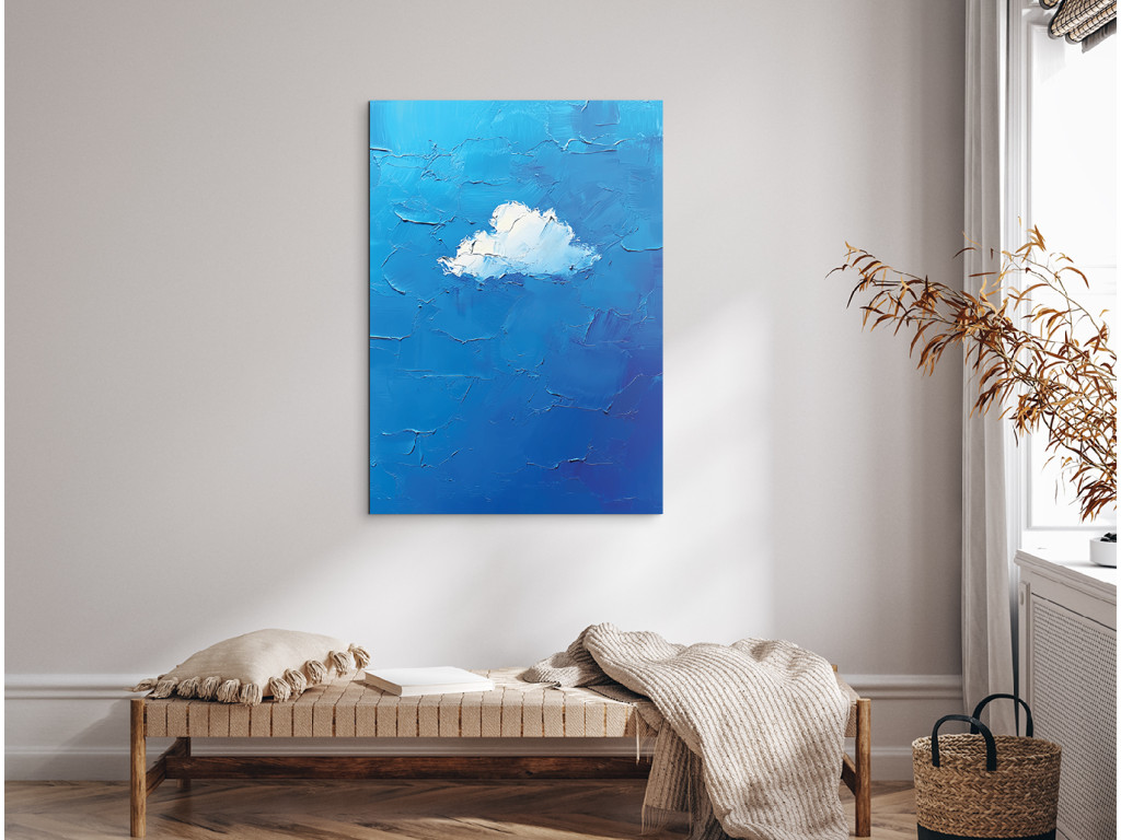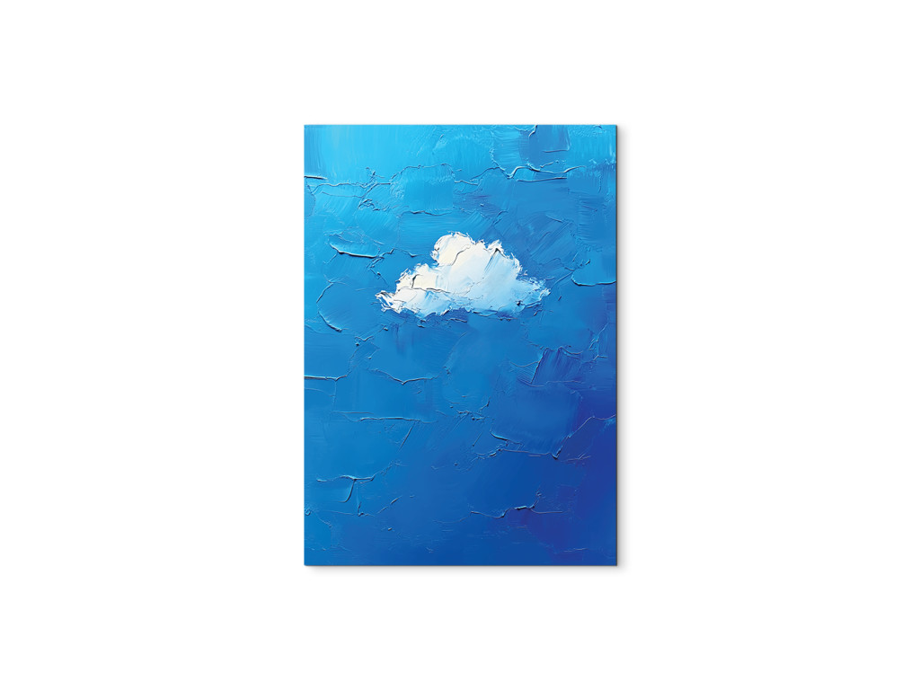 Obraz zobrazuje jediný biely oblak uprostred modrého pozadia. Je spracovaný s dôrazom na objem a jemnú textúru, čo v kontraste s čistou modrou plochou vytvára upokojujúci a minimalistický dojem.