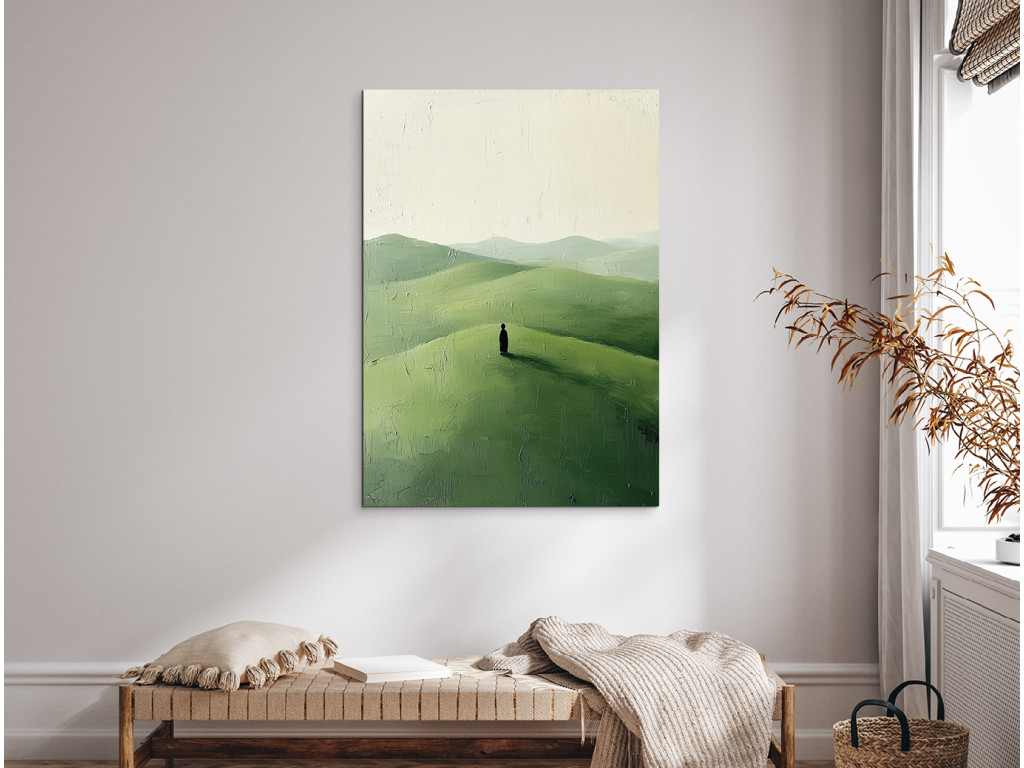 Minimalistická kompozícia zachytáva osamotenú postavu stojacu na zelenom kopci s jemne zvlnenou krajinou v pozadí. Svetlá obloha a prázdny priestor podčiarkujú pokoj, ticho a moment zastavenia.