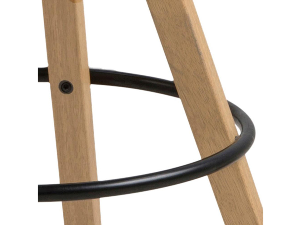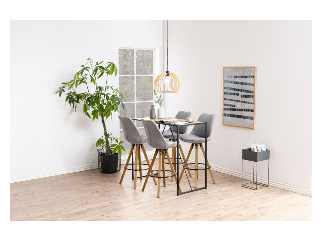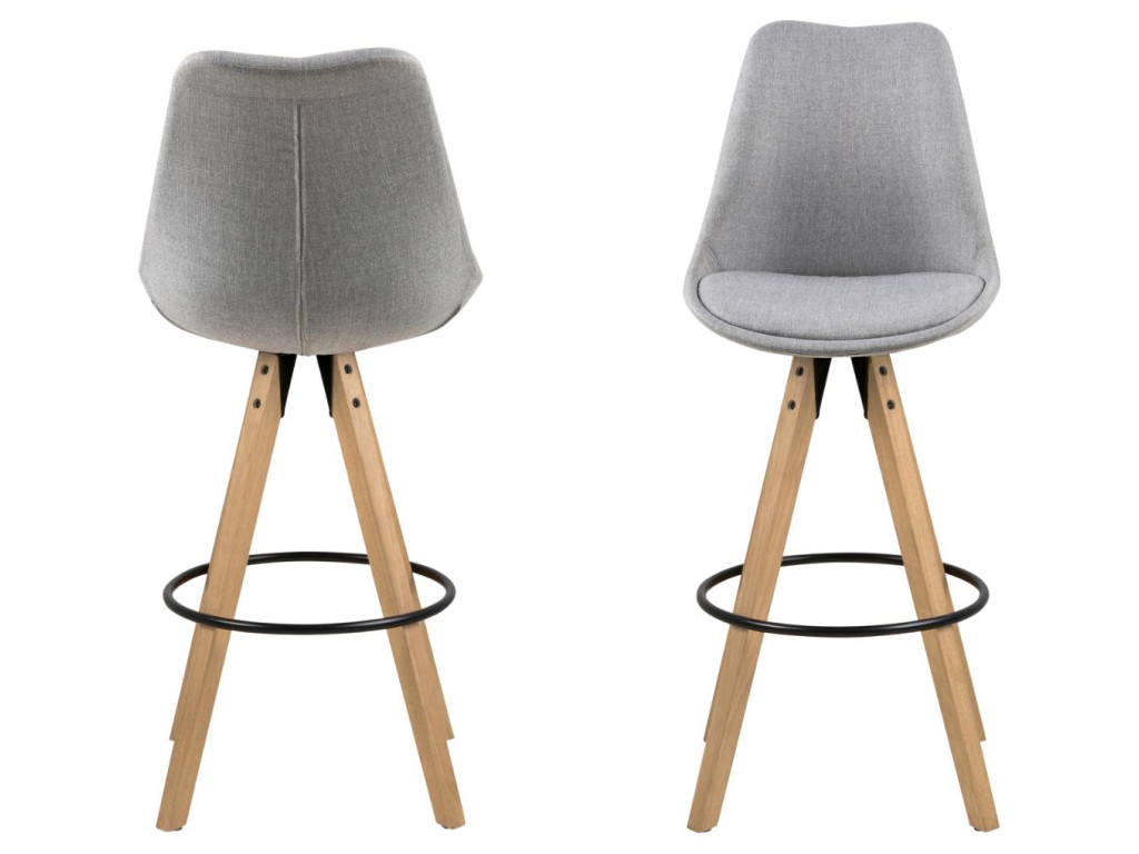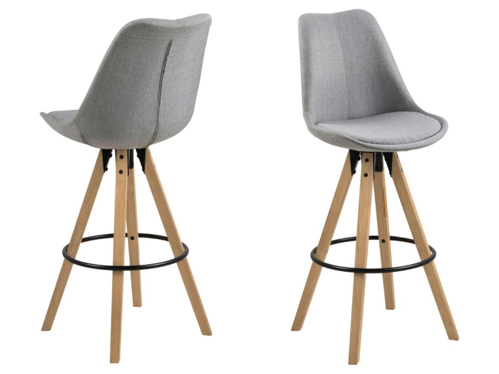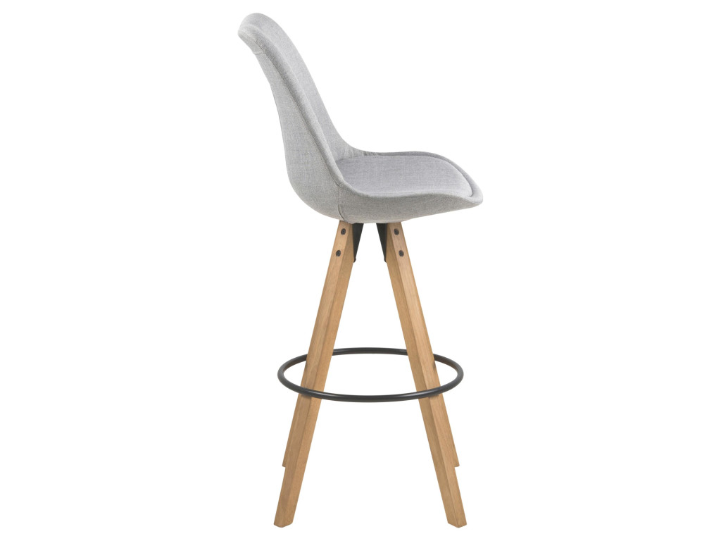 Táto barová stolička ponúka komfort vďaka mäkkému čalúneniu a látke svetlosivej farby. Drevo lakované v prírodnom odtieni dodáva nádych škandinávskej elegancie. Vďaka ergonomickému tvaru a kvalitnému spracovaniu je vhodná na každodenné používanie.