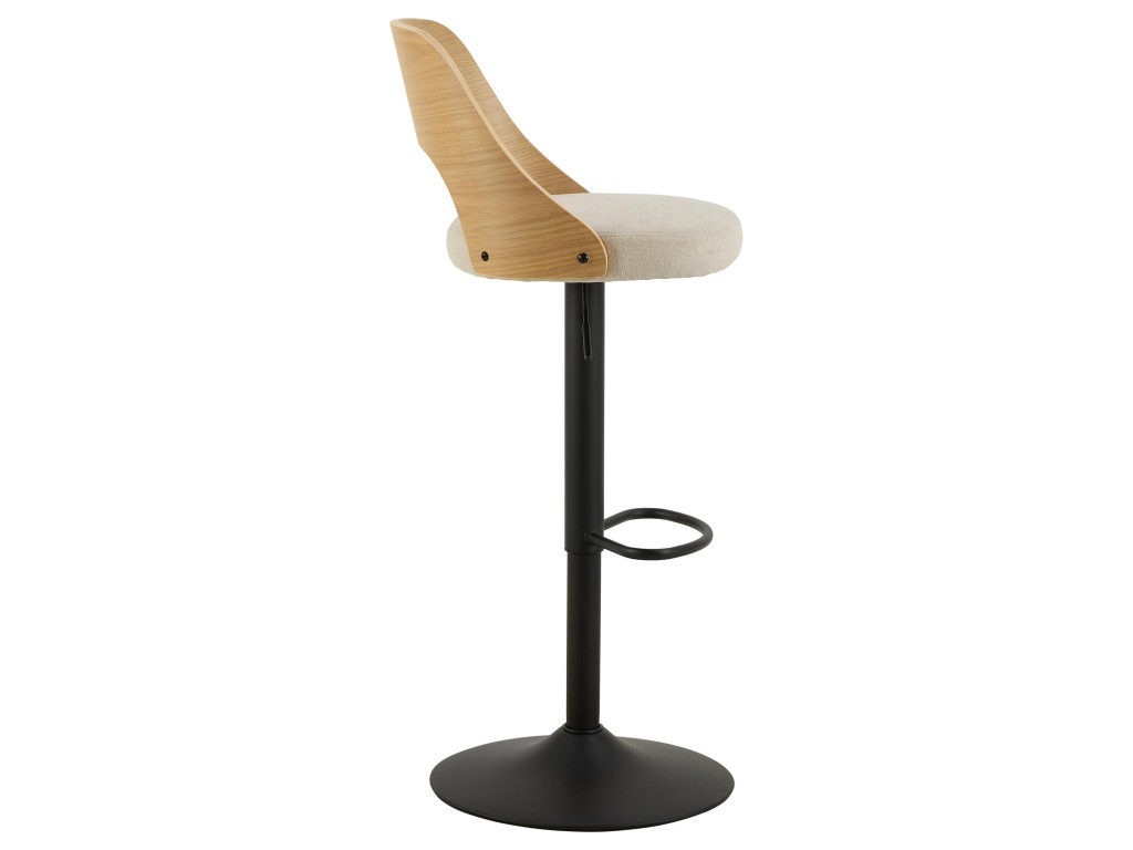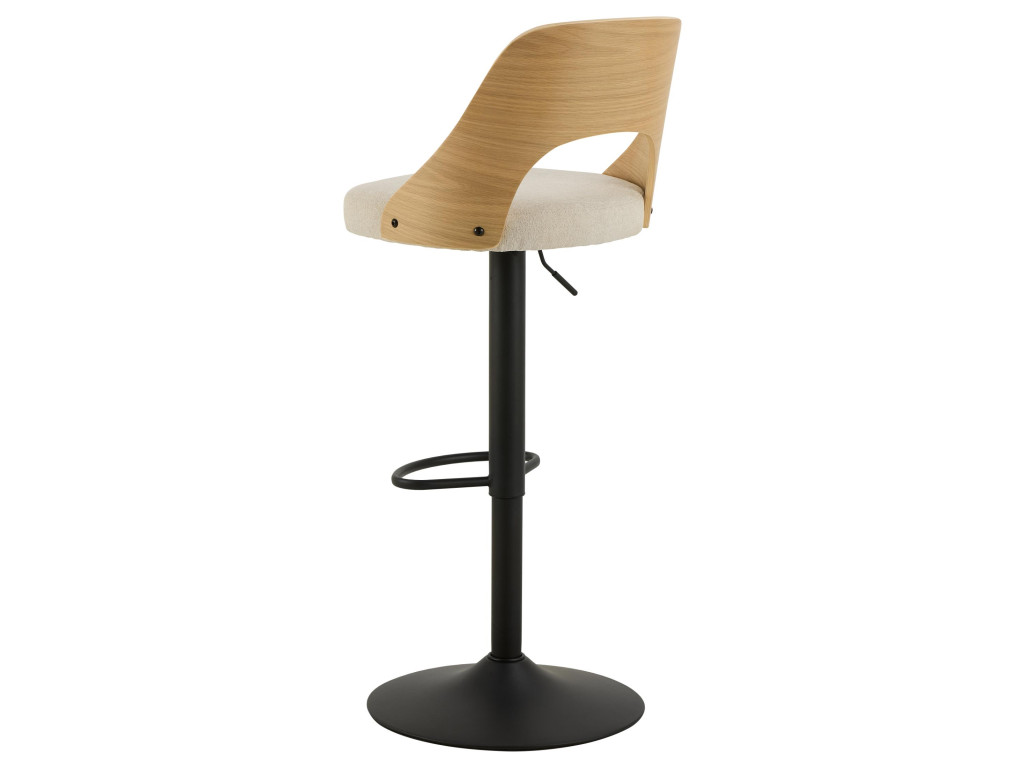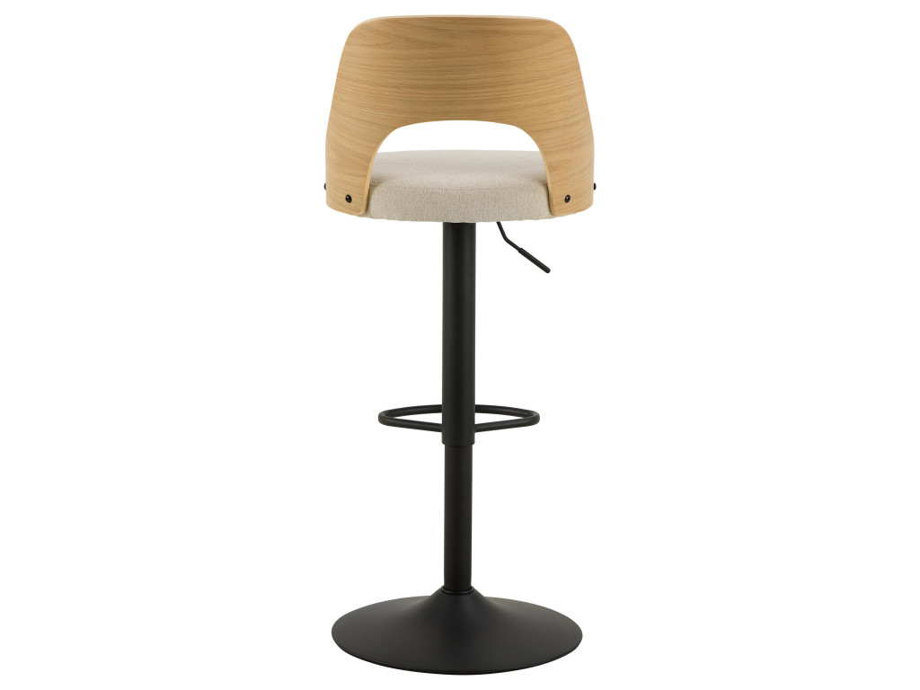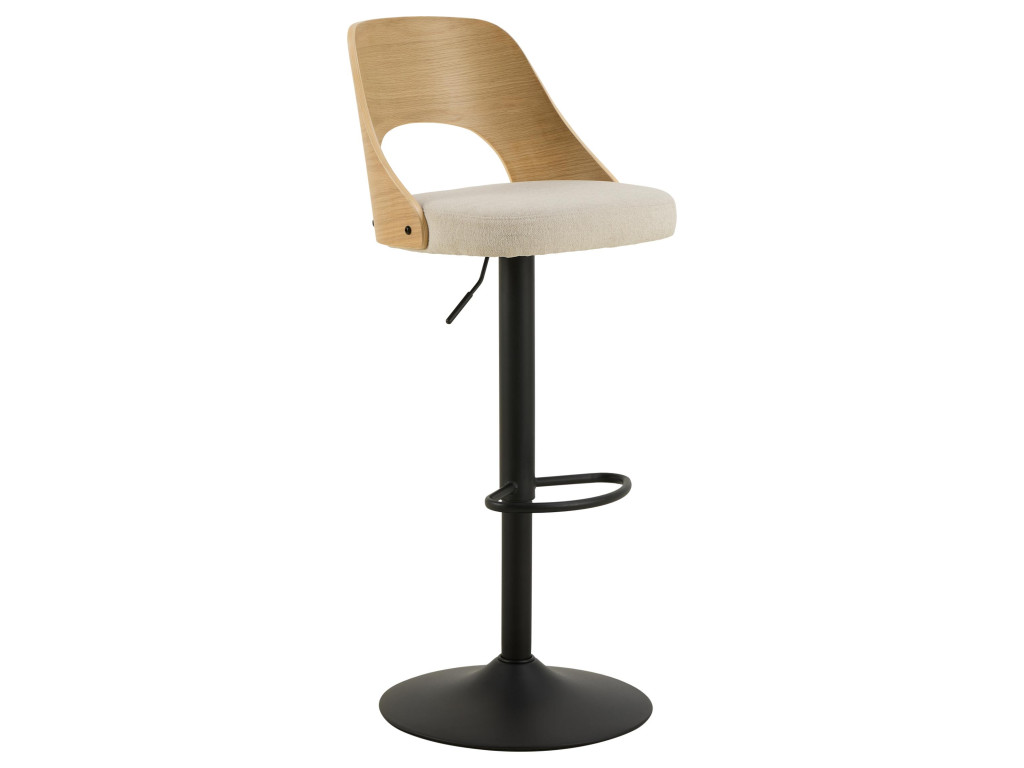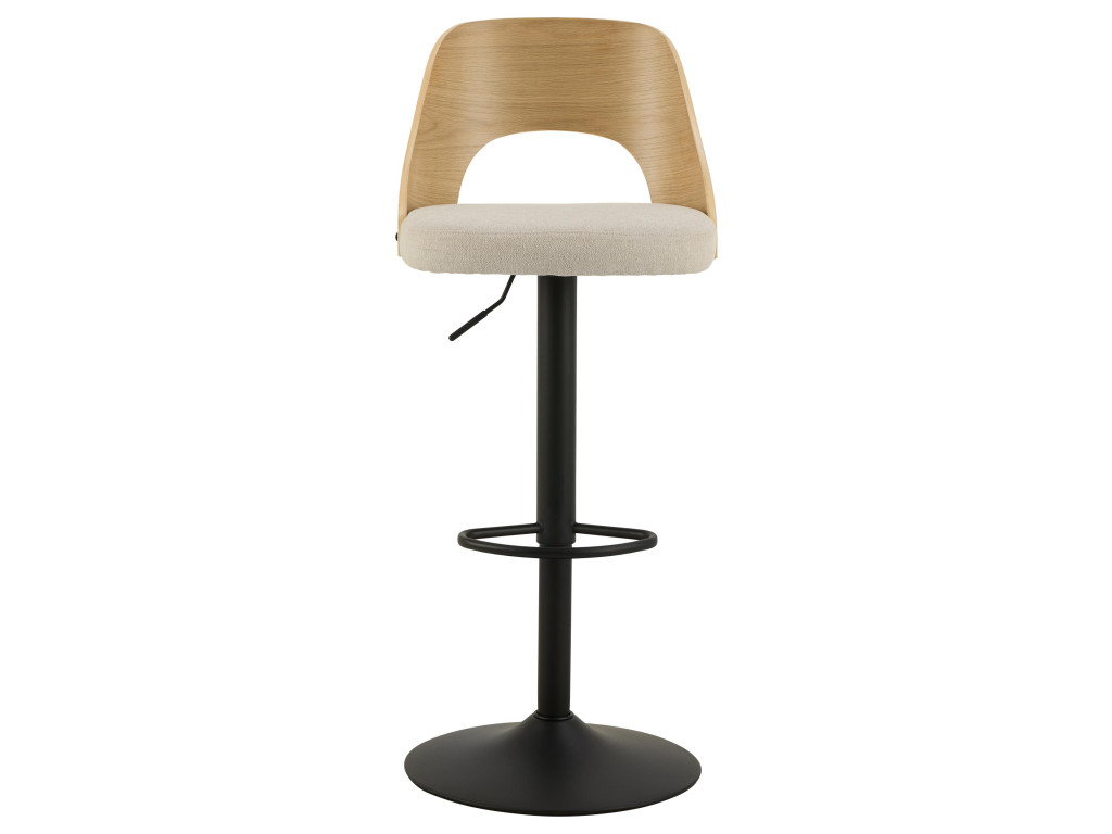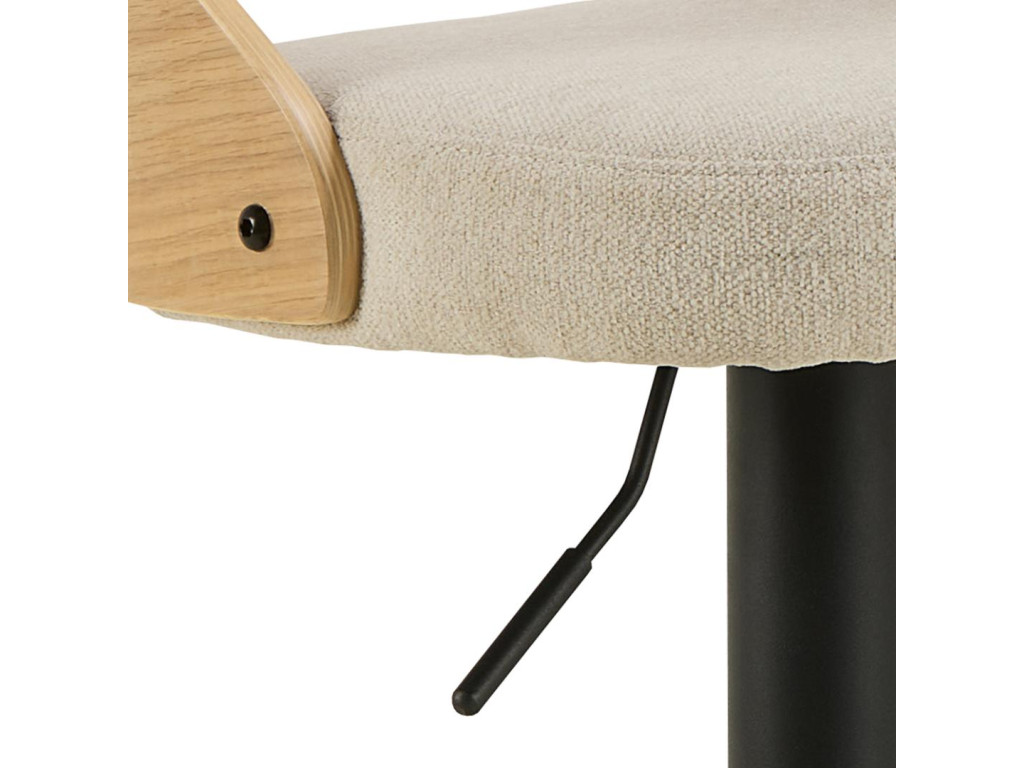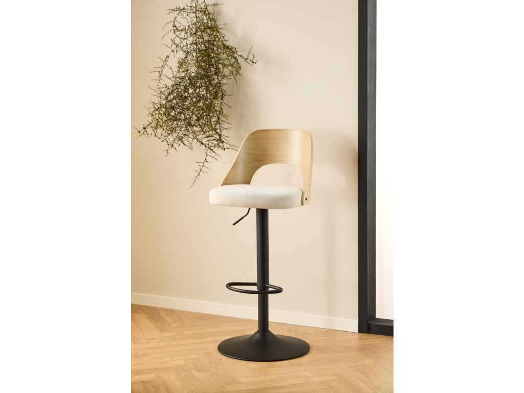 Elegantná barová stolička Lucys v kombinácii béžového čalúnenia, dubovej dyhy a čiernej ocele prináša do interiéru štýl aj pohodlie. Otočný mechanizmus a plynový zdvih zvyšujú komfort pri sedení. Balenie obsahuje dve stoličky ideálne k barovému pultu alebo vysokému stolu.