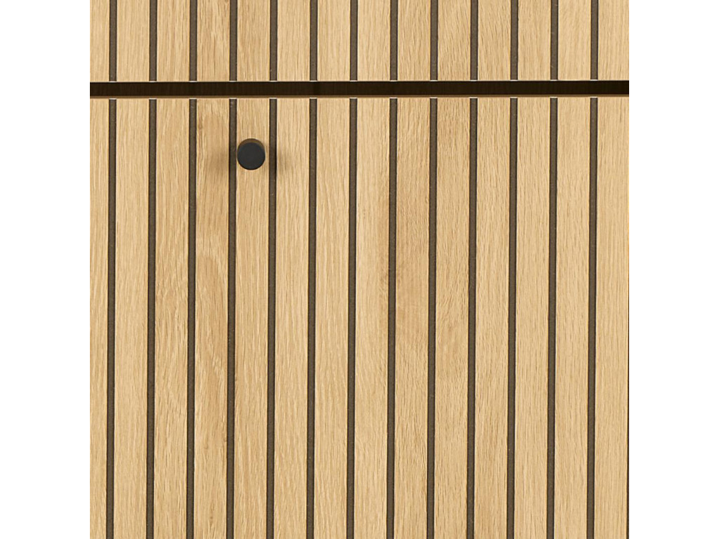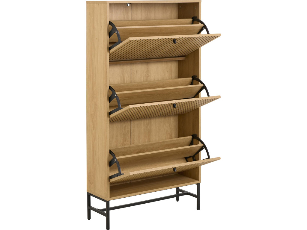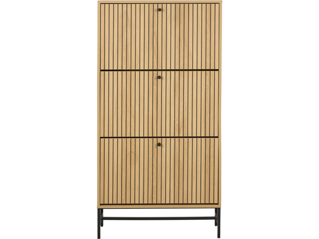 Štýlová skrinka na topánky s lamelovým čelom v dekore divokého duba a čiernou kovovou podnožou. Obsahuje 3 výklopné zásuvky na prehľadné a diskrétne uloženie topánok. Vďaka svojmu úzkemu profilu sa ideálne hodí do chodby či vstupného priestoru.