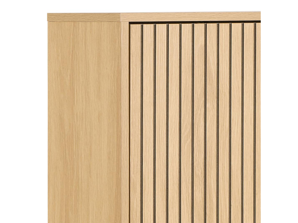 Elegantná kombinácia dekoru divokého duba a čiernej ocele, praktická výška a štíhla hĺbka, ako aj lamelový dizajnový detail, robia z modelu Albany A štýlový a funkčný doplnok do každého moderného interiéru.