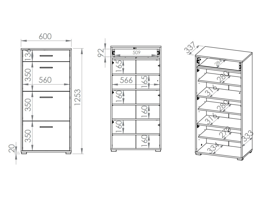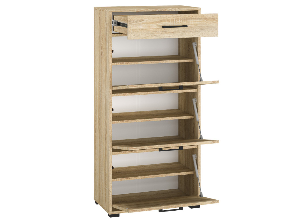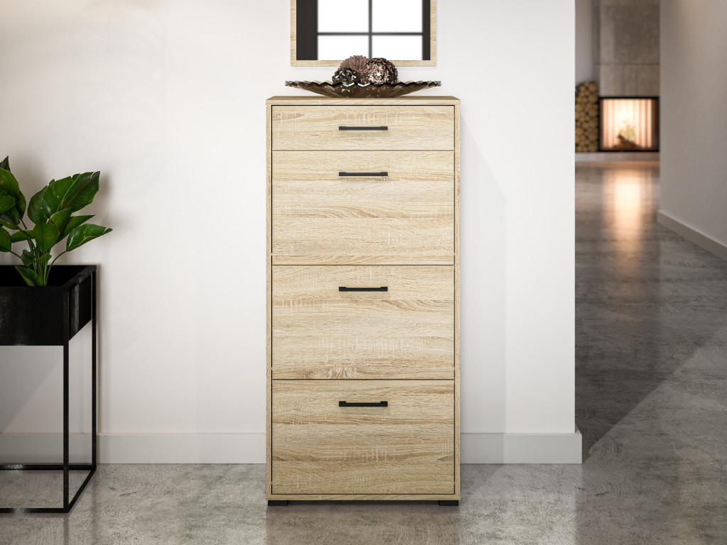 Botník Caro 14 je elegantný a praktický kúsok, ktorý šetrí priestor a zároveň ponúka dostatok miesta na organizáciu obuvi. V hornej časti je zásuvka, ktorá je ideálna na odkladanie drobností, ako sú kľúče, rukavice či príslušenstvo k topánkam. Pod zásuvkou sa nachádzajú tri skrinky s vyklápacími dvierkami, ktoré poskytujú dostatok priestoru na uskladnenie väčšieho množstva obuvi. Štíhly a vysoký dizajn botníka je ideálny pre menšie predsiene alebo úzke priestory.