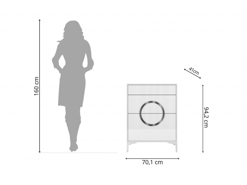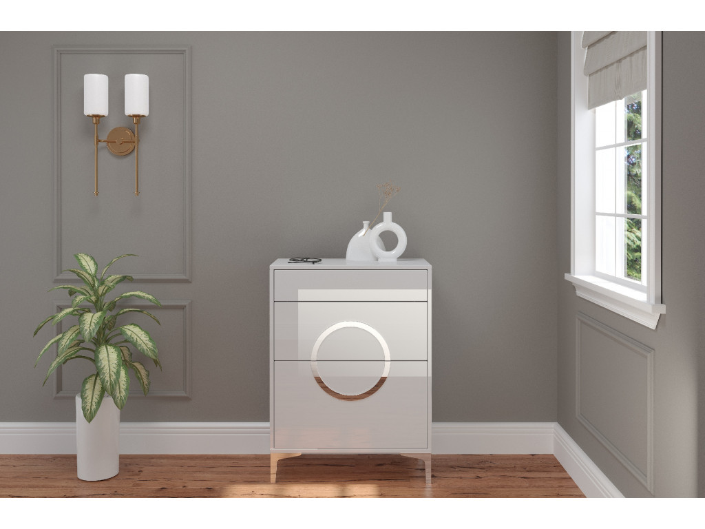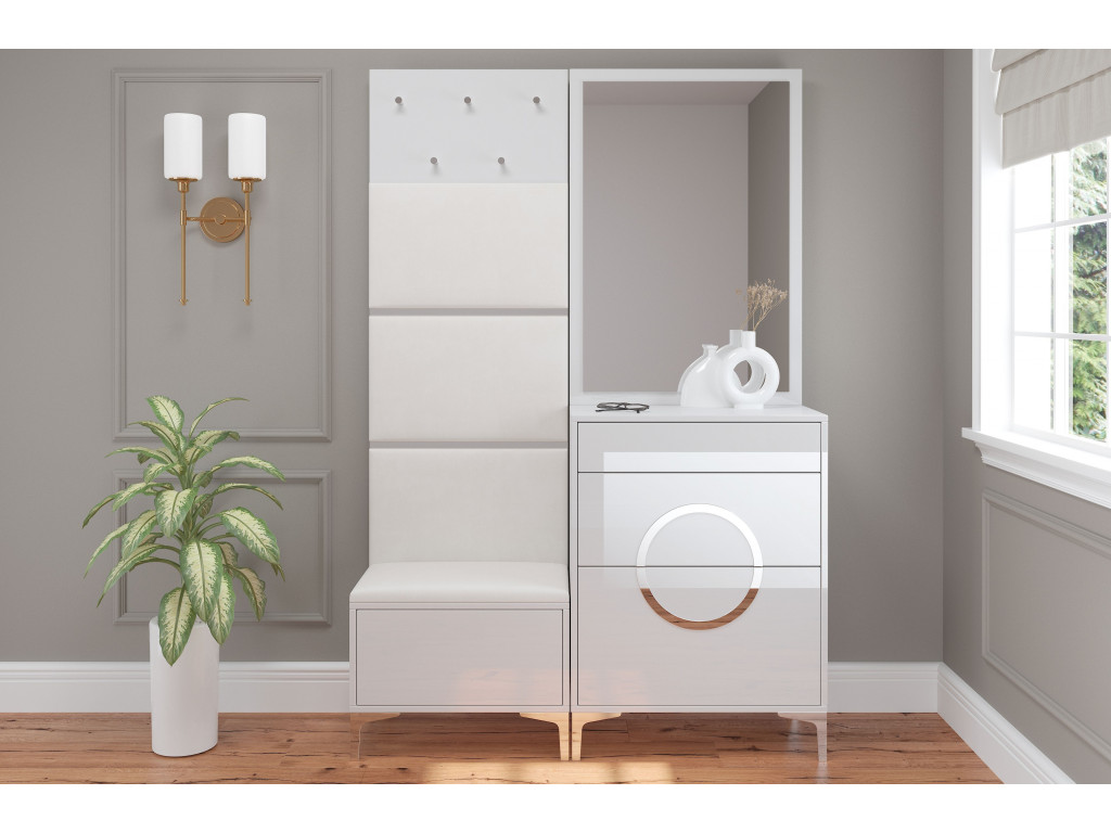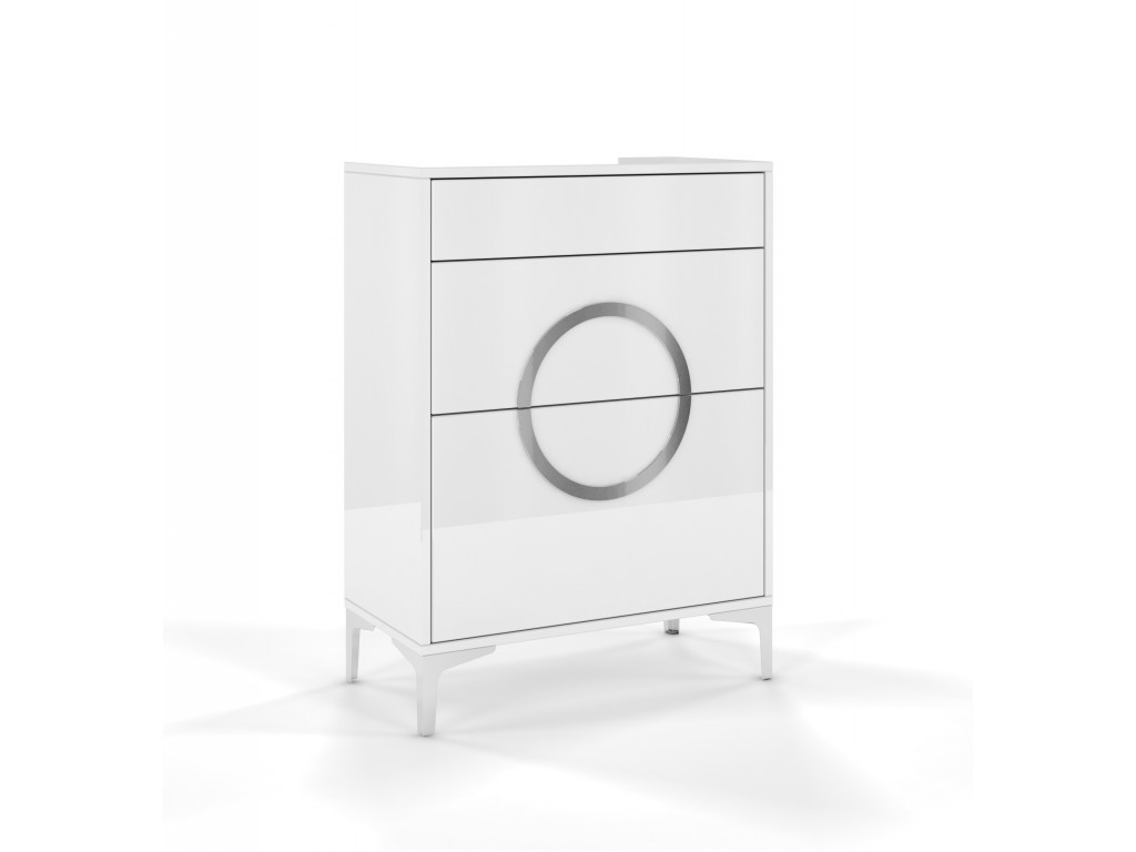 Funkčná komoda s dizajnovým prvkom, vybavená tromi zásuvkami rôznych veľkostí, poskytne priestor pre uskladnenie oblečenia a drobností v predsieni. Elegantná biela farba dokonale korešponduje s chrómovými nožičkami a vkusným zrkadlovým kruhom zdobiacim prednú časť nábytku.