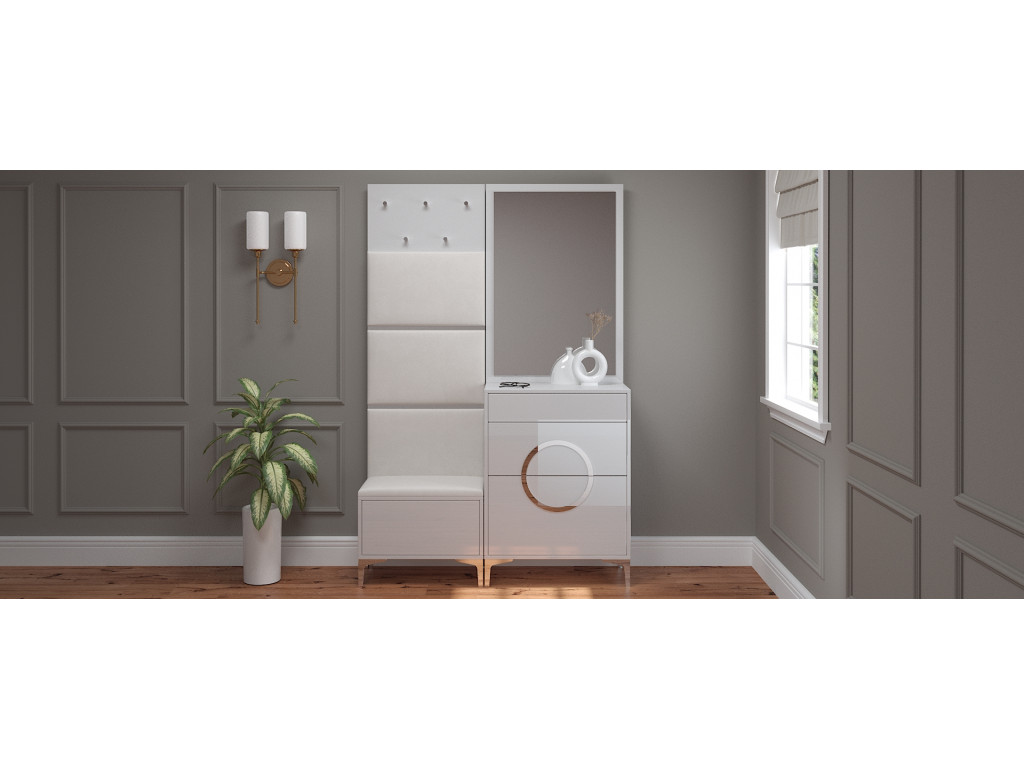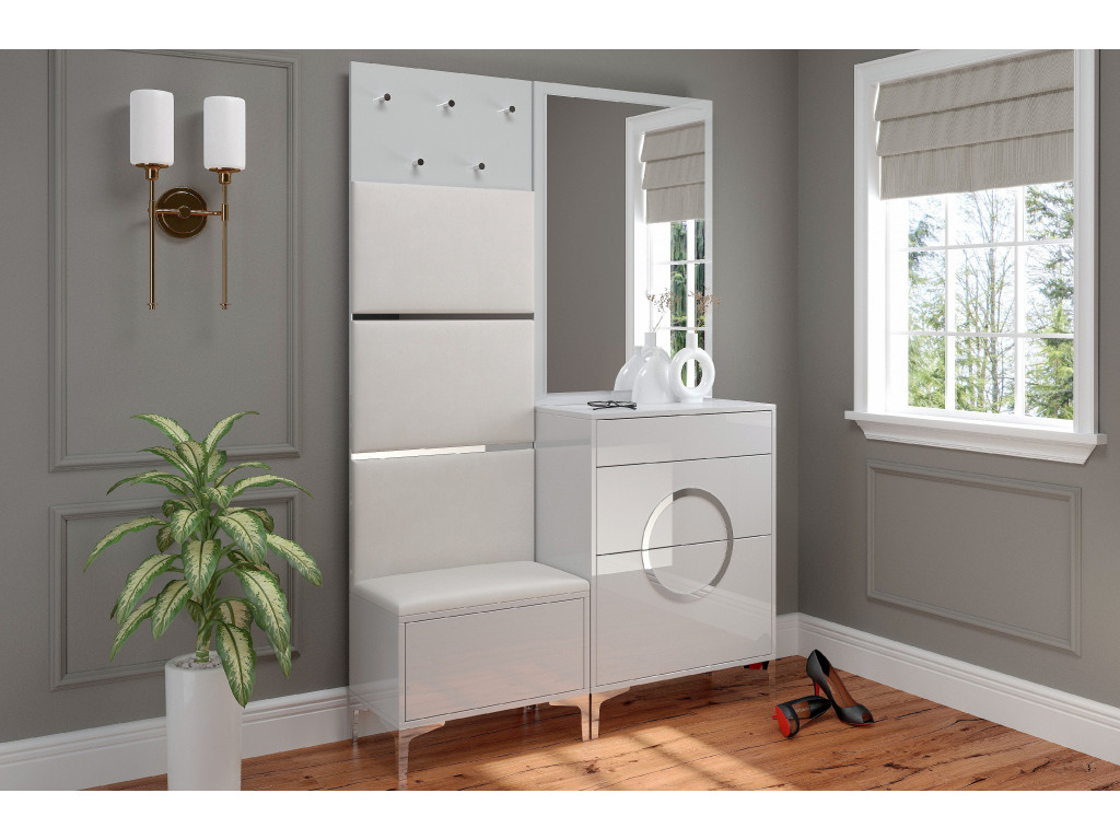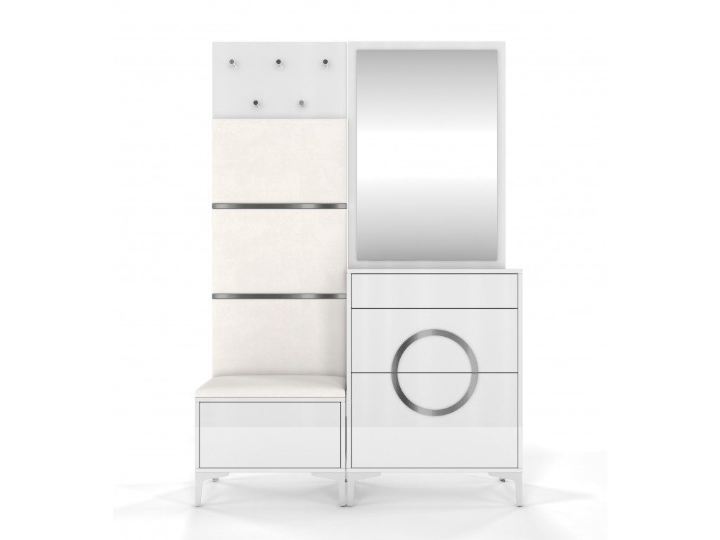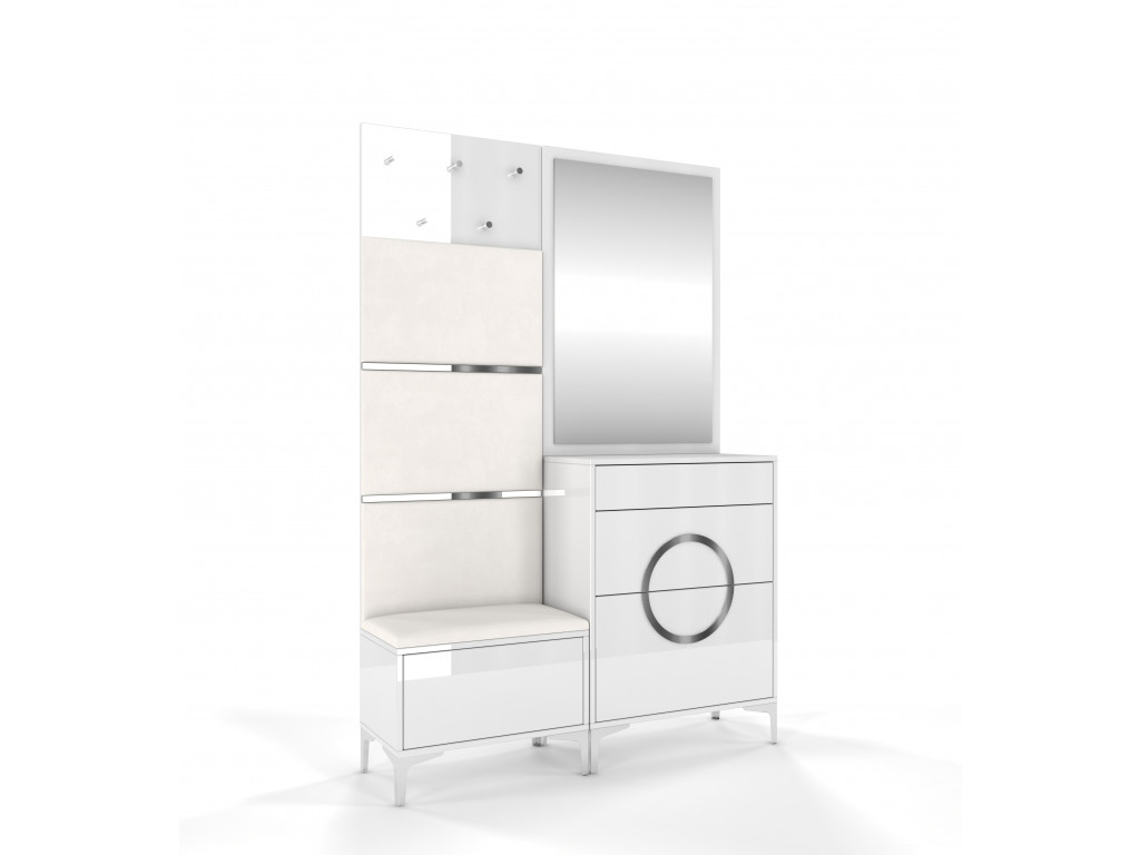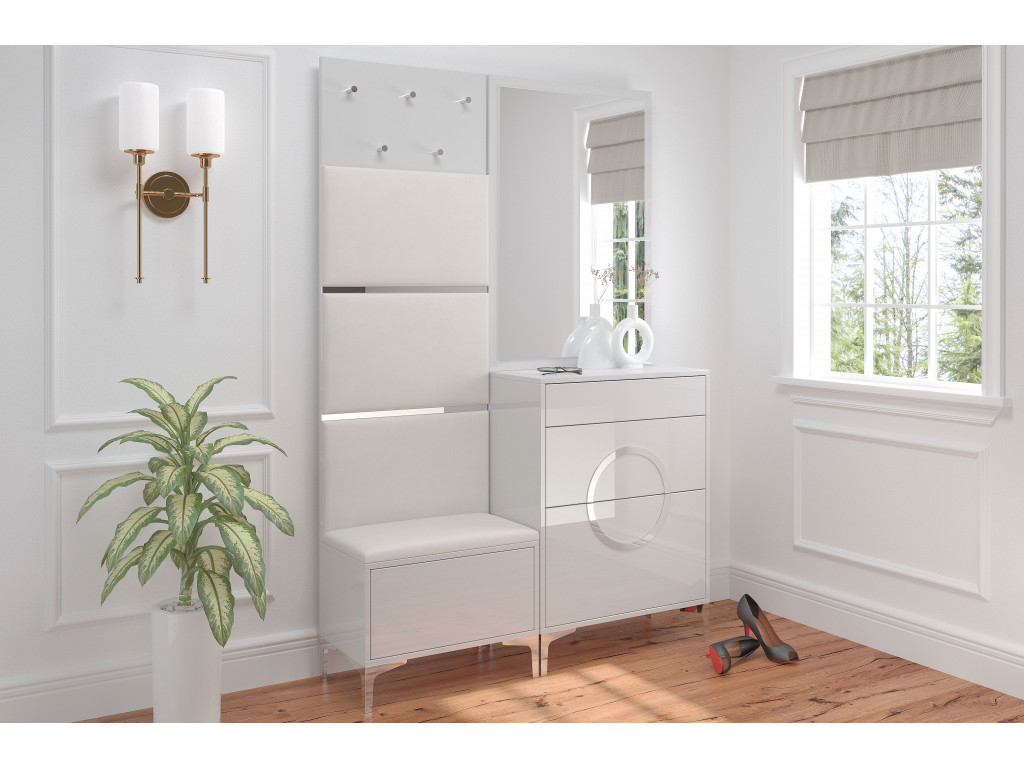 Funkčná komoda s dizajnovým prvkom, vybavená tromi zásuvkami rôznych veľkostí, poskytne priestor pre uskladnenie oblečenia a drobností v predsieni. Elegantná biela farba dokonale korešponduje s chrómovými nožičkami a vkusným zrkadlovým kruhom zdobiacim prednú časť nábytku.