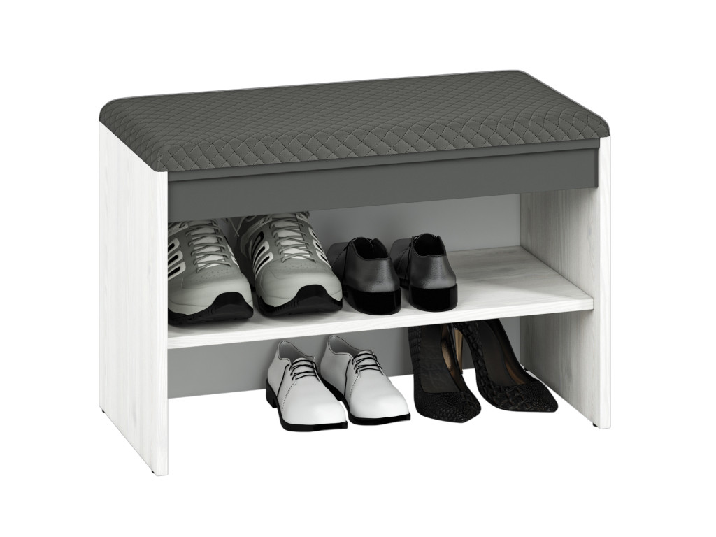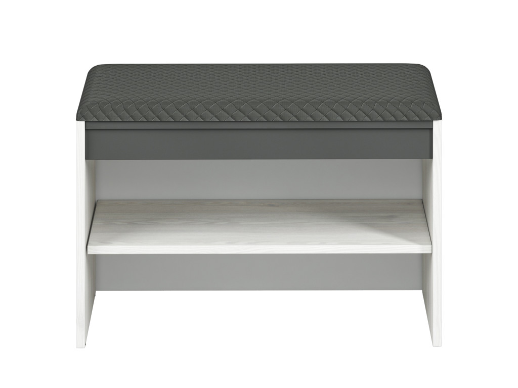 Kontrastné spojenie dekorov bielej borovice a antracitu dodáva nábytku elegantný a odľahčený vzhľad, ktorý harmonicky zapadne do každého interiéru. Tmavosivé prešívané čalúnenie na vešiakoch a sedení pridáva nadčasovú eleganciu a zároveň poskytuje vysoký komfort.