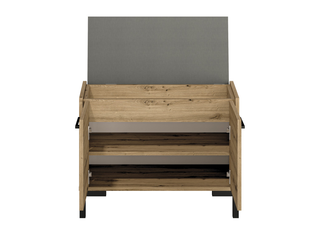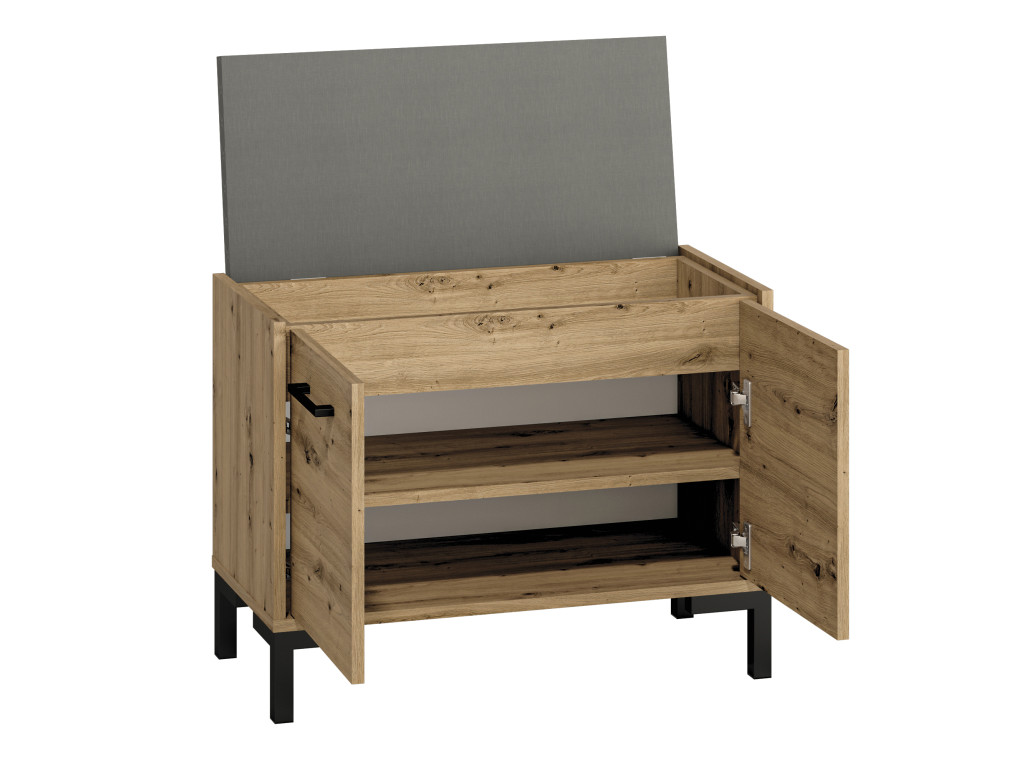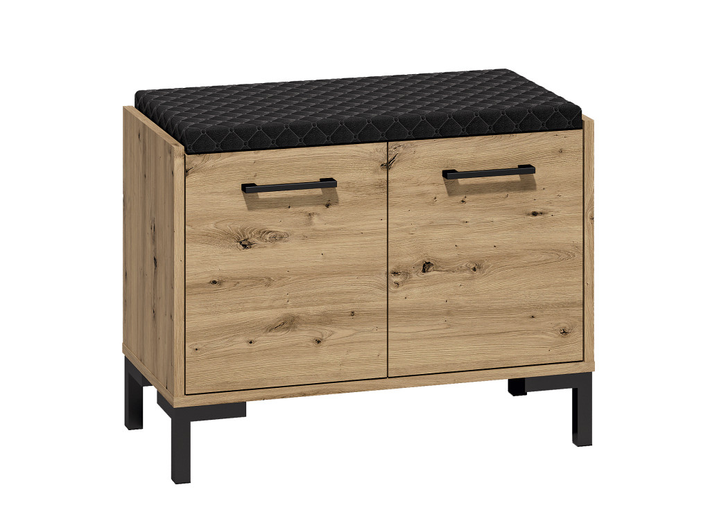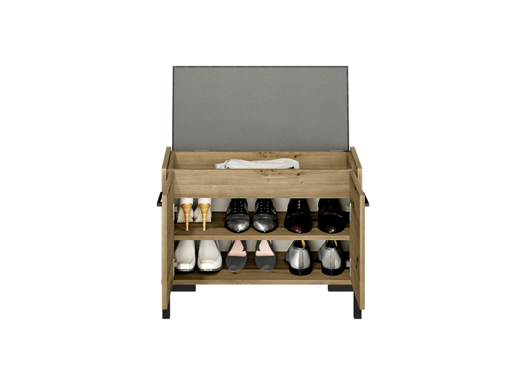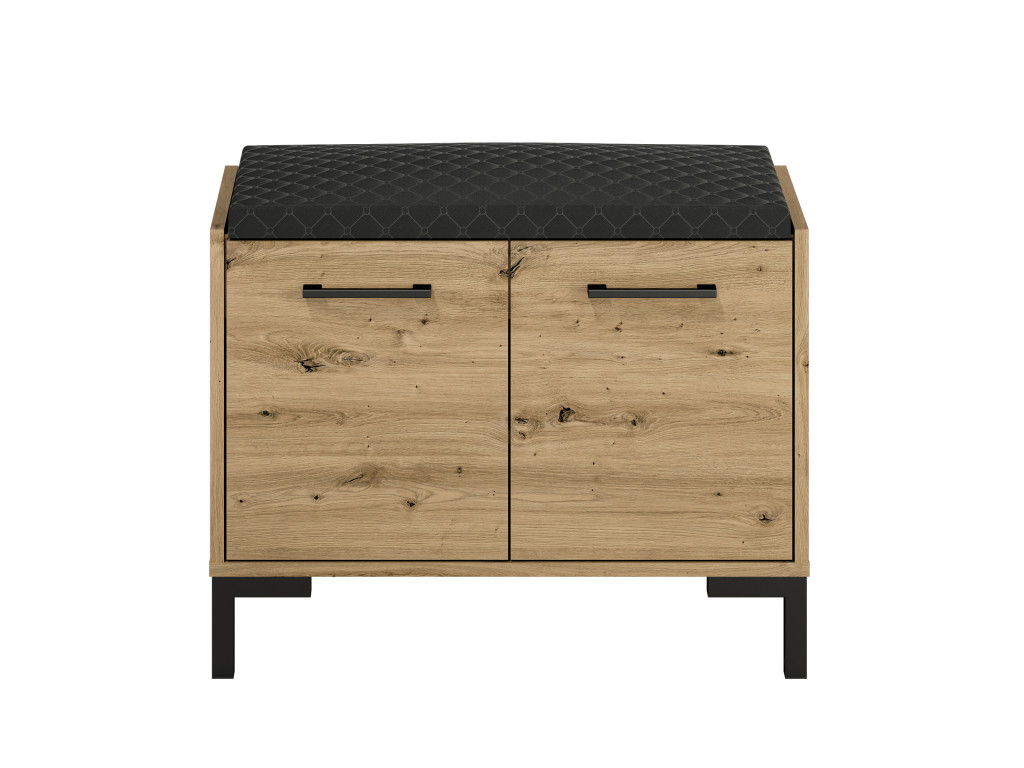 Botník na topánky Nelin 04 ponúka dve dvierka na obuv, pohodlný čalúnený podsedák z čiernej ekokože a skrytý úložný priestor pod ním. Kombinuje praktickosť s elegantným dizajnom, ktorý oživí každú predsieň.