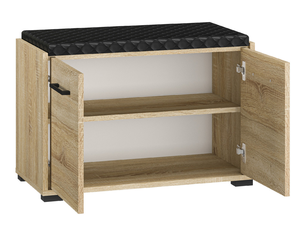 Botník Caro 02 má dvojdverový úložný priestor, čierny podsedák a dekor svetlej sonomy. Elegantné prevedenie a praktické detaily ho robia ideálnym doplnkom každej predsiene.