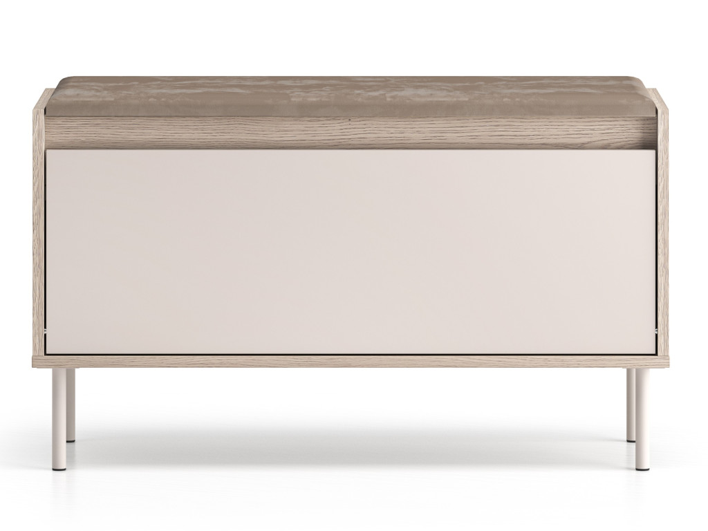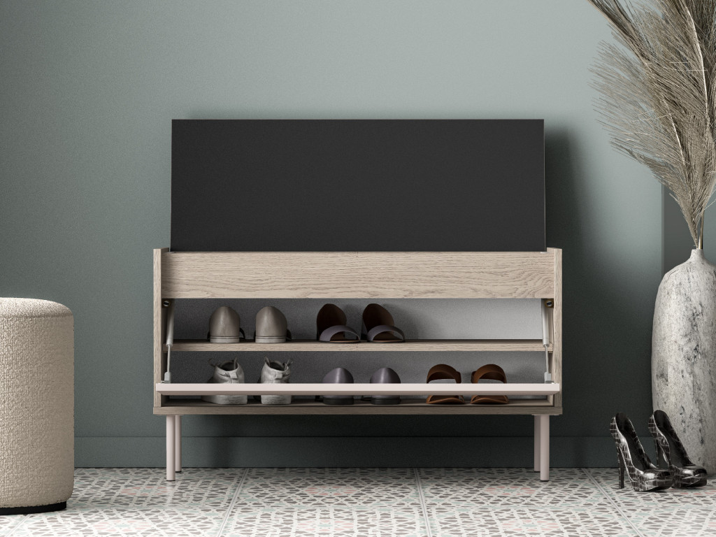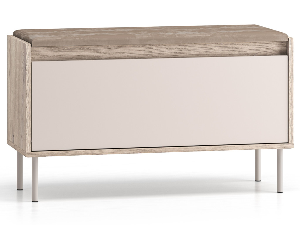 Minimalistické čelá v kašmírovej béžovej farbe v kombinácii s dubom krémovým pôsobia elegantne a moderne. Botník stojí na vysokých kovových nohách v odtieni kašmíru a vďaka nosnosti až 100 kg ho možno pohodlne využiť ako lavicu na obúvanie. Samozrejmosťou je aj tiché dovieranie dvierok, ktoré zabezpečuje pohodlie a bezpečnosť pri každodennom používaní.