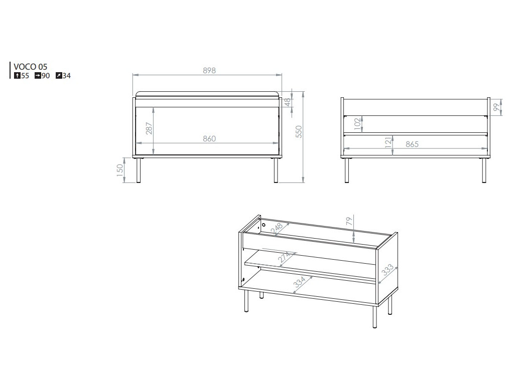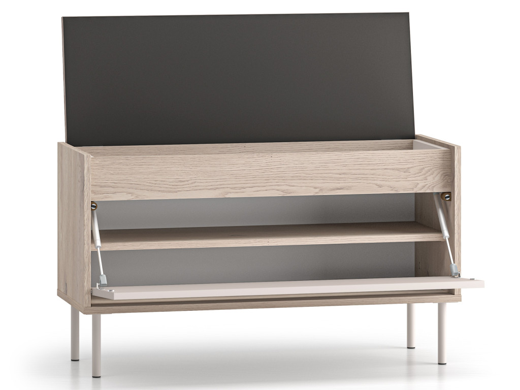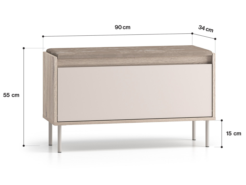 Botník Voco 05 spája praktické úložné riešenie s pohodlným sedením. Na ploche 90 × 34 × 55 cm ponúka hneď dva samostatné úložné priestory – pod vyklápacími dvierkami sa ukrýva miesto na topánky a pod zdvíhacím podsedákom ďalší priestor na doplnky či drobnosti. Podsedák je čalúnený mäkkým béžovým velúrom, ktorý je príjemný na dotyk a zvyšuje komfort používania.