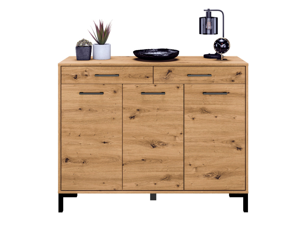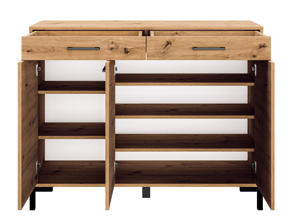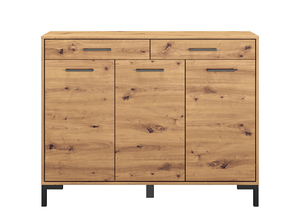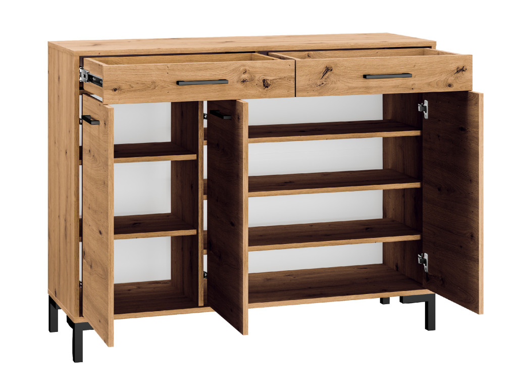Kolekcia Nelin je moderný a elegantný nábytkový rad navrhnutý pre predsiene a obývacie izby, ktorý sa dokonale hodí do loftových aj klasických interiérov. S výrazným dekorom dubu artisan na korpuse aj čelných plochách dodáva nábytok priestoru teplý, útulný charakter, pričom čierne plastové úchytky a 12 cm vysoké čierne matné nožičky pridávajú prvkom moderný kontrast a štýl. Zásuvky s guľôčkovými plnovýsuvnými pojazdmi zaisťujú pohodlné a plné vysunutie, ideálne pre jednoduchý prístup k uloženým predmetom.