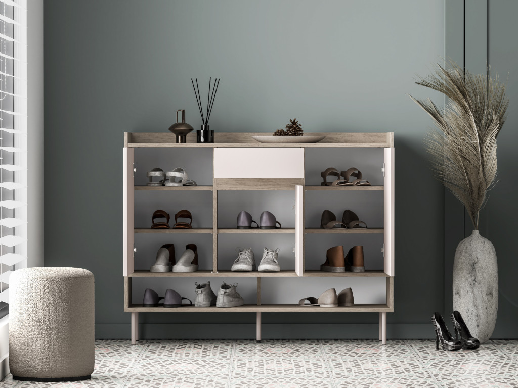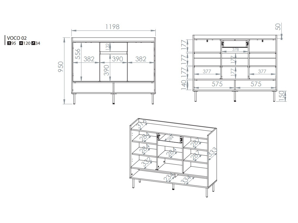 Botník Voco 02 ponúka praktické riešenie na uskladnenie väčšieho množstva obuvi a zároveň pôsobí elegantne a moderne. S rozmermi 120 × 34 × 95 cm poskytuje dostatok priestoru vďaka 6 poličkám ukrytým za trojicou dvierok. Okrem toho je vybavený aj jednou menšou zásuvkou, ktorá je ideálna na uloženie drobných predmetov, ako sú kľúče, kefy na topánky alebo iné doplnky.