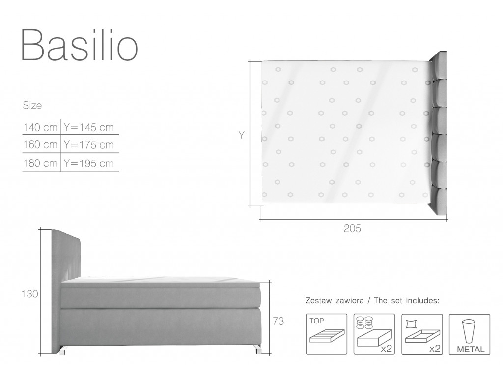 Čalúnená posteľ Basilio je boxspringová posteľ, ktorá sa vyznačuje vysokým matracom, veľkým čalúneným rámom, vysokým čelom a extrémne mäkkým matracom. Posteľ je vybavená pružinovým matracom Bonnell s hrúbkou 20 cm s vrstvou peny T25 na oboch stranách a 4 cm vrchným topperom z peny T21. Ďalšou výhodou je priestranný úložný priestor na posteľnú bielizeň v spodnej časti rámu. K dispozícii sú rukoväte a pružinový zdvih pre ľahké otvorenie základne matraca pre prístup k úložnému priestoru. Vybrať si môžete z 3 veľkostí 140 x 200, 160 x 200 a 180 x 200 cm.