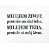 Darujte svojej milovanej/svojmu milovanému drevený citát na stenu "Milujem život, pretože mi dal teba. Milujem teba, pretože ty si môj život" a vyjadrite jej/mu tým svoju bezhraničnú úctu a vernú lásku. Nálepka krásne dotvorí dizajn celej miestnosti a pritiahne na seba všetky pohľady. Vynikajúci darček napríklad k výročiu svadby alebo na Valentína, prípadne kedykoľvek ako nečakané romantické prekvapenie.