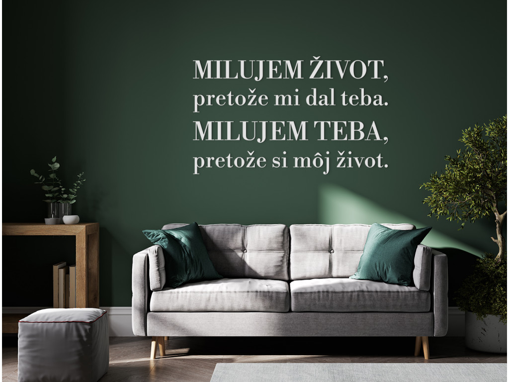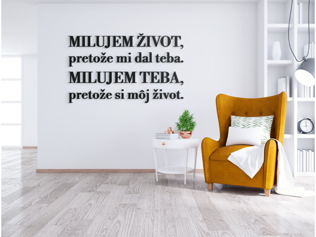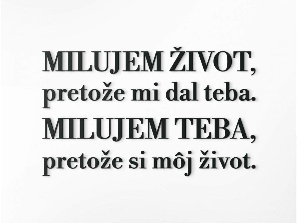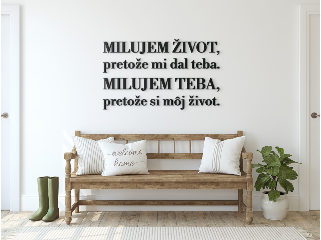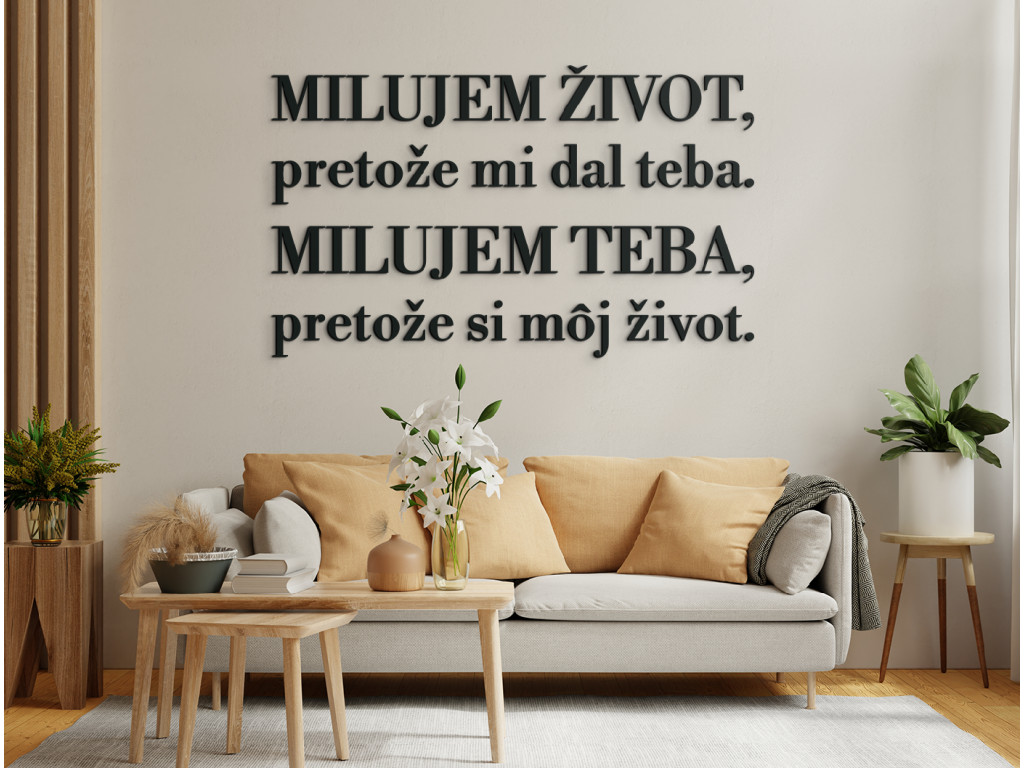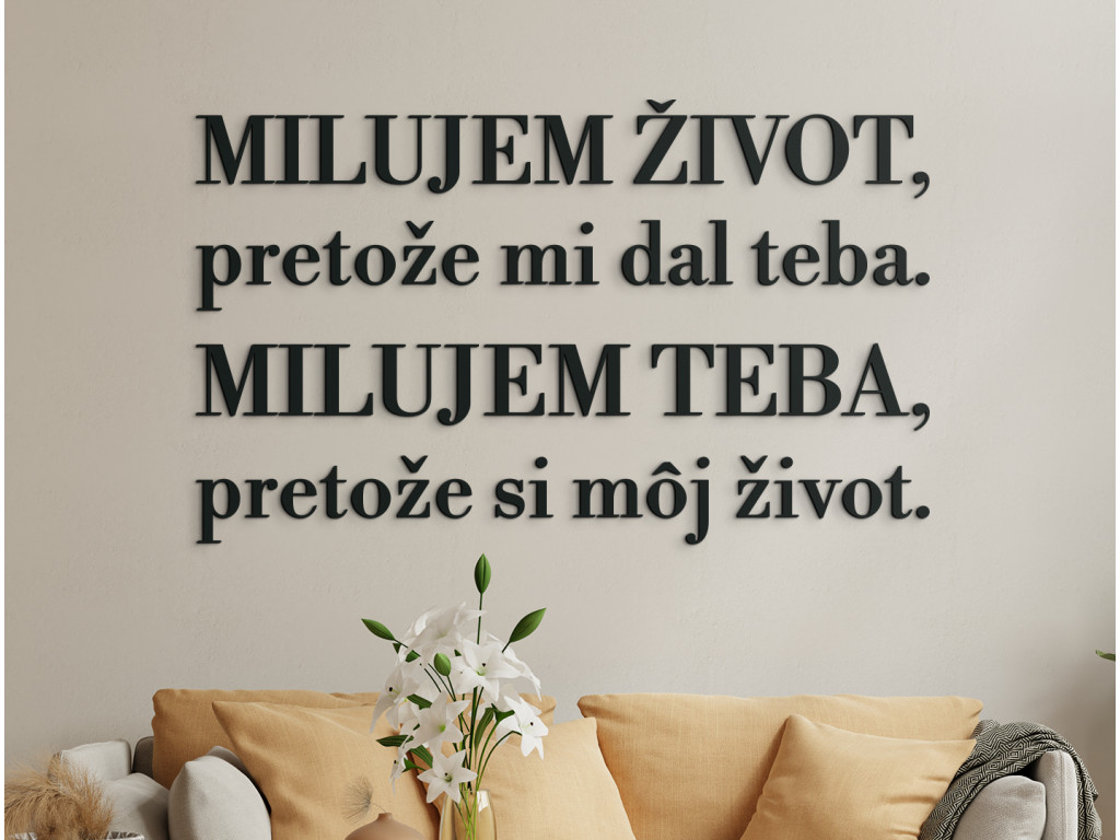 Darujte svojej milovanej/svojmu milovanému drevený citát na stenu "Milujem život, pretože mi dal teba. Milujem teba, pretože ty si môj život" a vyjadrite jej/mu tým svoju bezhraničnú úctu a vernú lásku. Nálepka krásne dotvorí dizajn celej miestnosti a pritiahne na seba všetky pohľady. Vynikajúci darček napríklad k výročiu svadby alebo na Valentína, prípadne kedykoľvek ako nečakané romantické prekvapenie.