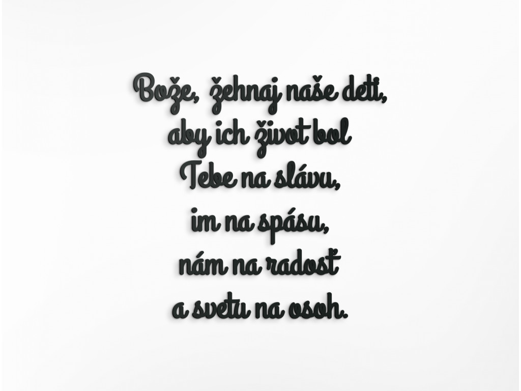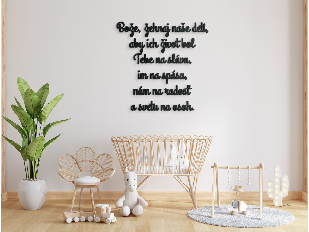 Citát na stenu "Bože, žehnaj naše deti, aby ich život bol Tebe na slávu, im na spásu, nám na radosť a svetu na osoh." je otvoreným vyznaním toho, aký vrúcny vzťah máte k svojej rodine. Moderný dizajn a pôsobivý obsah výroku zútulnia akúkoľvek miestnosť. Citát môžete nalepiť napríklad do predsiene, chodby, detskej izby alebo obývačky. Vybrať si môžete z viacerých dekorov, takže ho ľahko zladíte s nábytkom i ďalšími dekoráciami.
