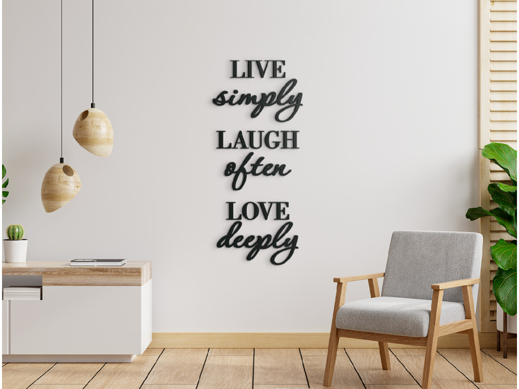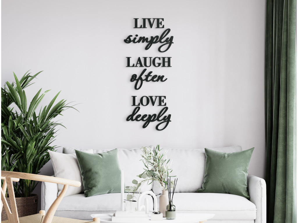 Drevený citát na stenu o živote Live simply, laugh often, love deeply je praktickým návodom, ako žiť naplno. Okrem toho, že oživí fádne steny v interiéri, bude vás motivovať, aby ste si vychutnali každý jeden deň so všetkým, čo prinesie.