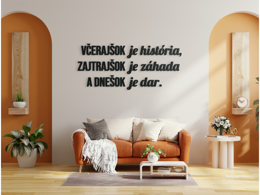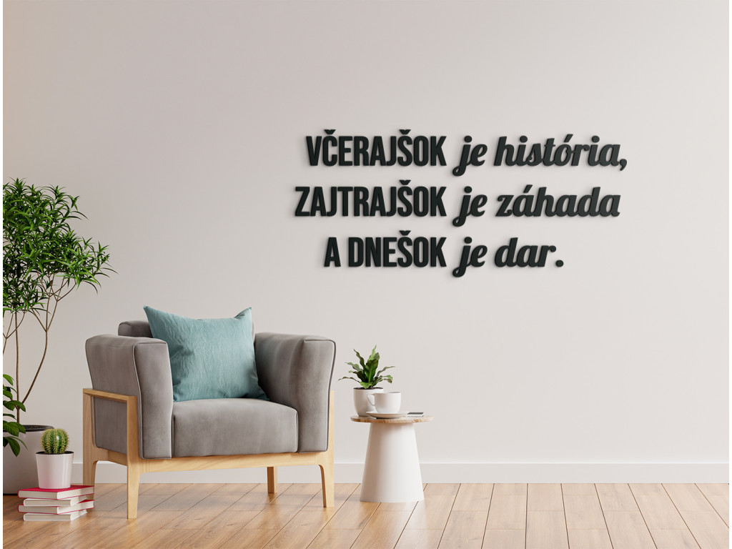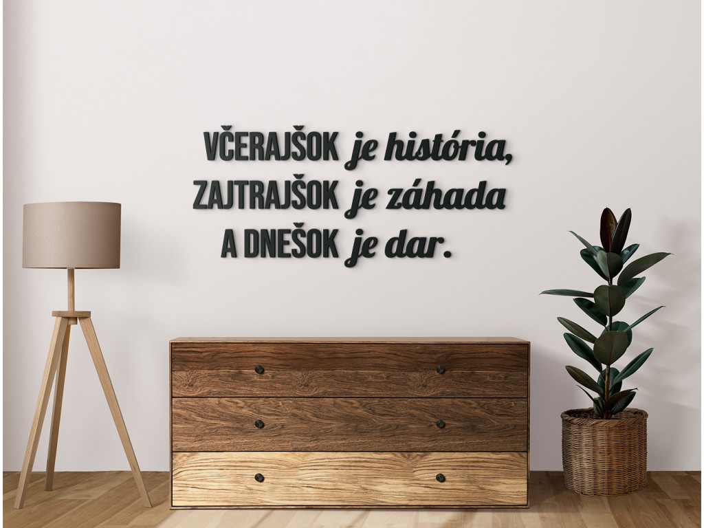 Ak máte radi výroky o živote, potom je pre vás ako stvorený drevený citát na stenu "Včerajšok je história, zajtrajšok je záhada a dnešok je dar." Veľká pravda, ktorá sa v ňom ukrýva, spolu s unikátnym dizajnom, z neho robí plnohodnotný doplnok do moderného i tradičnejšie ladeného interiéru. Poslúži tiež ako zaujímavý nápad na darček.