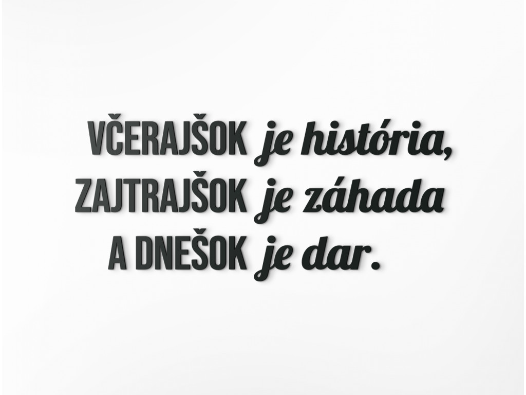 Citát Včerajšok je história, zajtrajšok je záhada sa hodí napríklad do predsiene, chodby, pracovne alebo obývačky. V ponuke je k dispozícii niekoľko dekorov na výber, takže ho ľahko zladíte s nábytkom i ďalšími dekoráciami.
