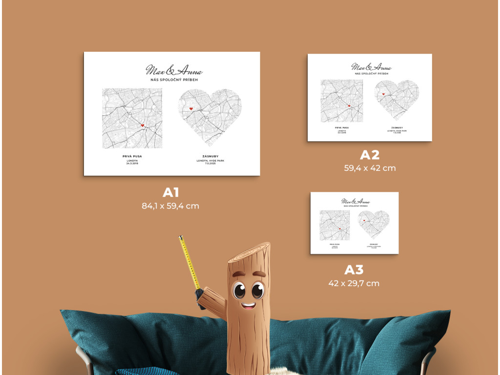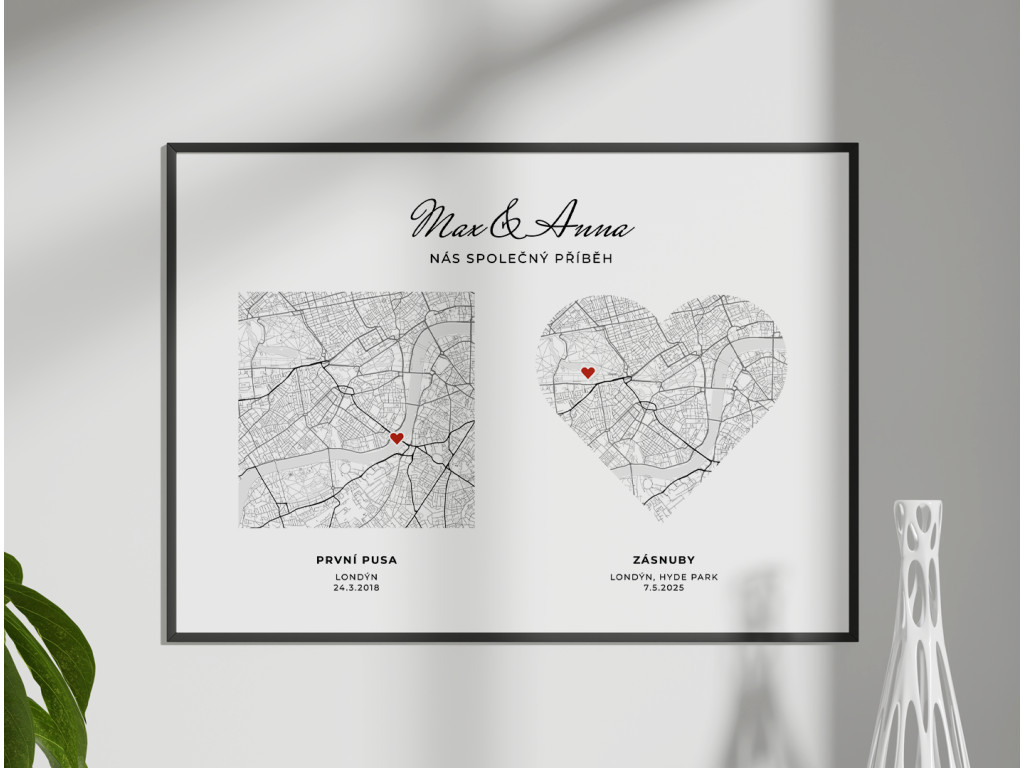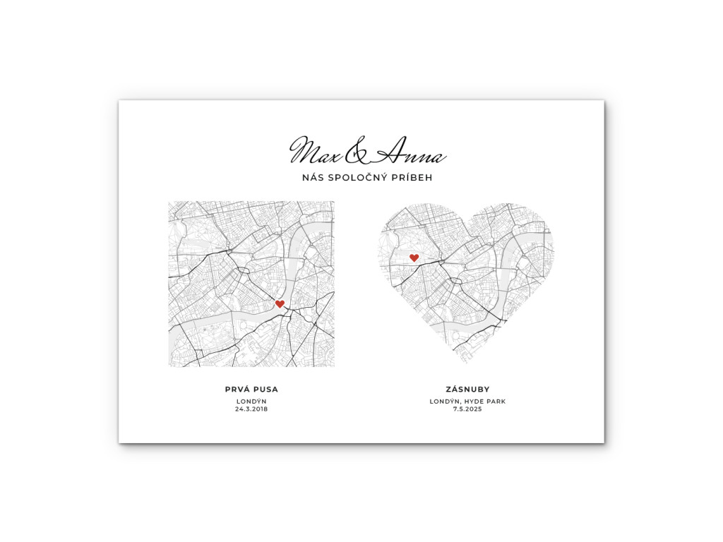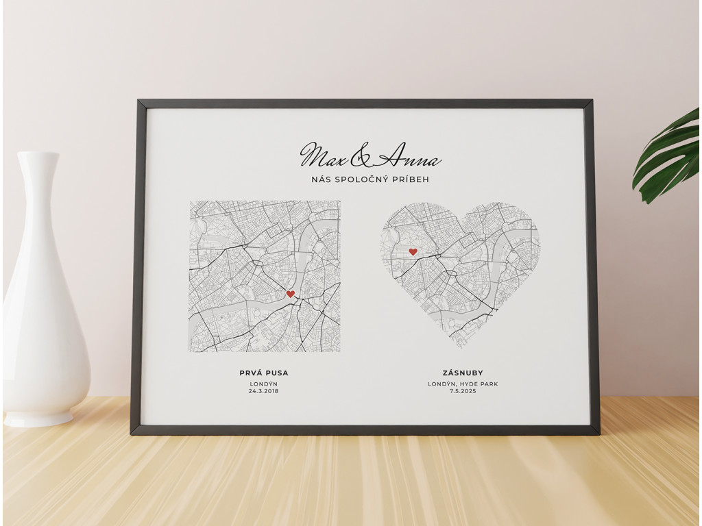Darčekový obraz s dvomi mapami, na ktorých sú srdiečkami vyznačené vaše dôležité miesta. Každú mapu si môžete upraviť – vybrať tvar, doplniť vlastný text, mená, dátum aj presnú polohu. Vznikne tak výnimočný obraz, ktorý zachytí váš príbeh. Ideálny darček pre partnera, na výročie, zásnuby, svadbu či akýkoľvek spoločný moment, ktorý chcete uchovať navždy.