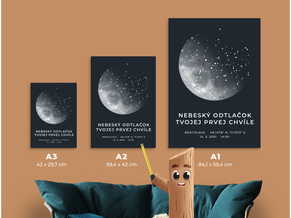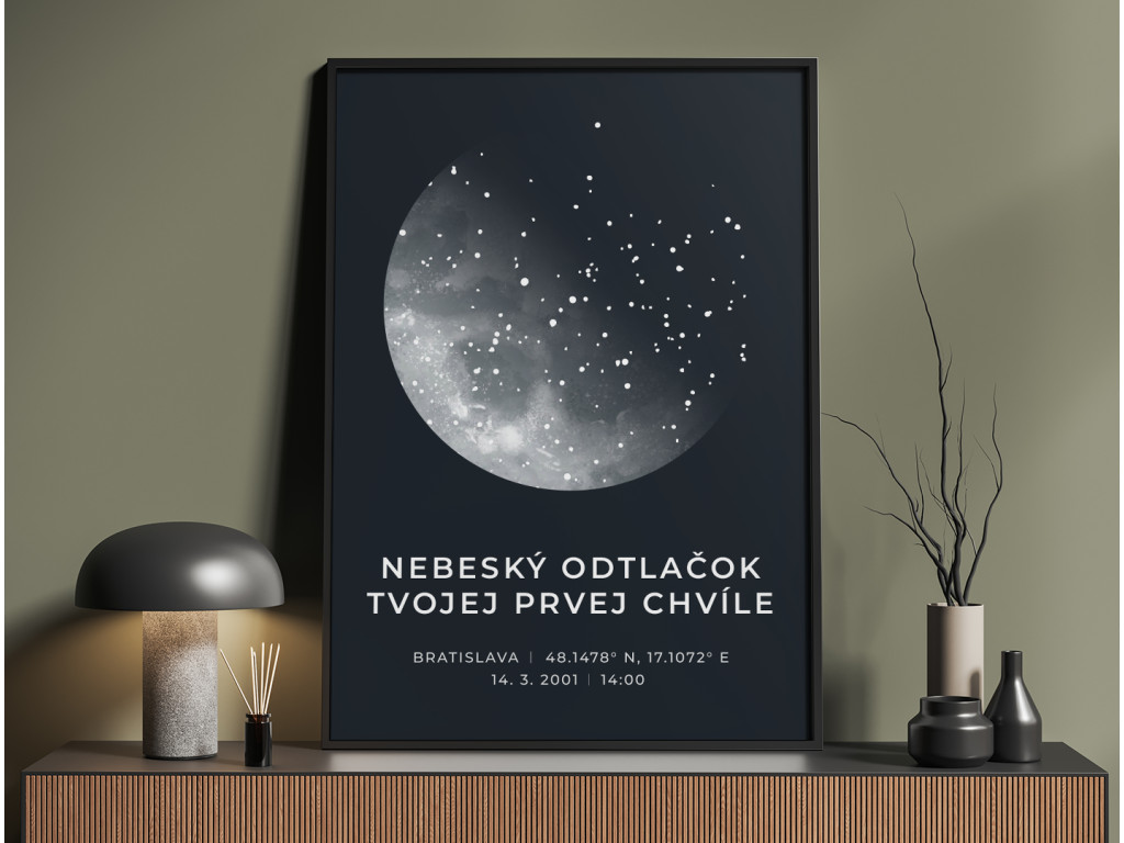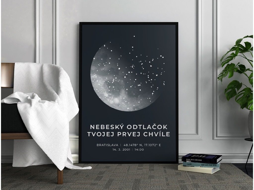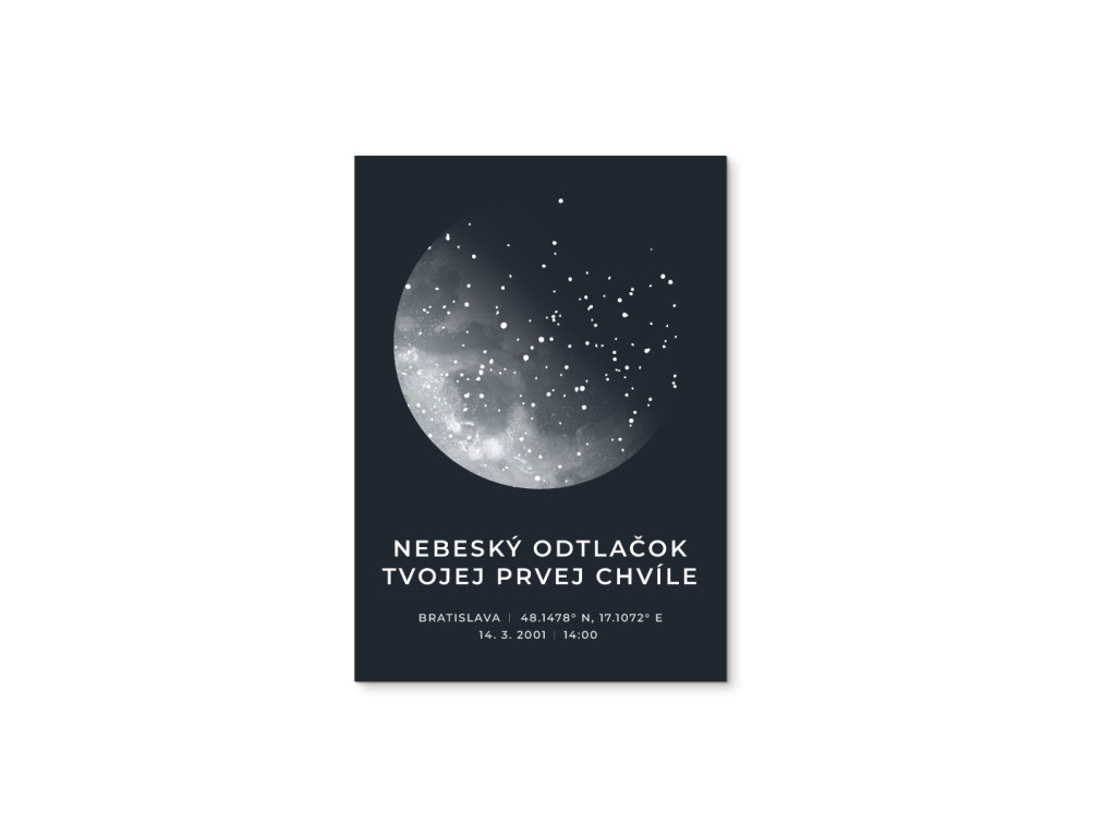 Hviezdna mapa na mieru, ktorá zobrazuje presné postavenie hviezd v okamihu, ktorý je pre vás výnimočný. Vyberiete si súradnice, dátum, čas aj miesto udalosti a doplníte vlastný text. Vznikne tak jedinečný obraz zachytávajúci narodenie, zásnuby, svadbu či akýkoľvek moment, ktorý si chcete uchovať navždy. Skvelý darček plný emócií.