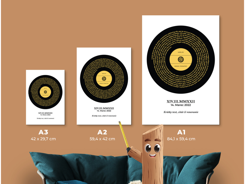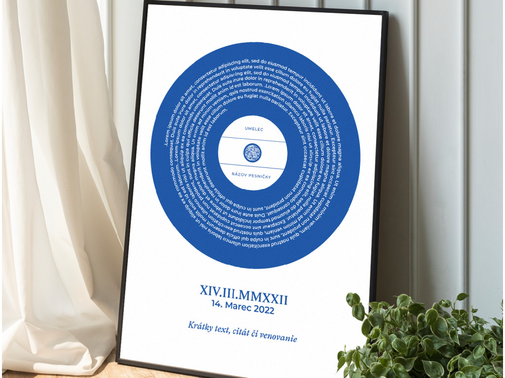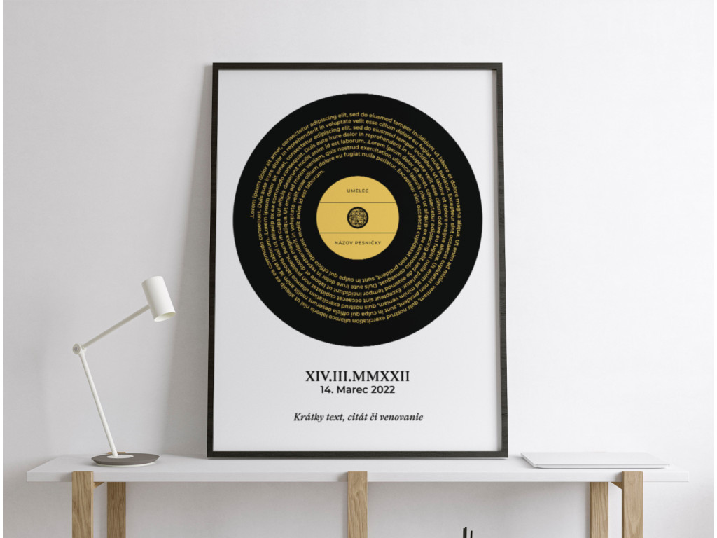 Originálny obraz v štýle platne, do ktorého si môžete vložiť text svojej obľúbenej piesne, názov skladby, interpreta aj vlastné venovanie či dátum. Súčasťou je aj QR kód, ktorý po naskenovaní prehrá vybranú pieseň priamo v telefóne. Dostupný v rôznych farbách, predstavuje výnimočný a osobný darček pre partnera, kamarátov či rodinu.