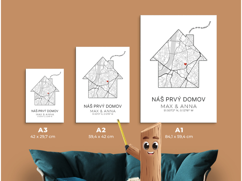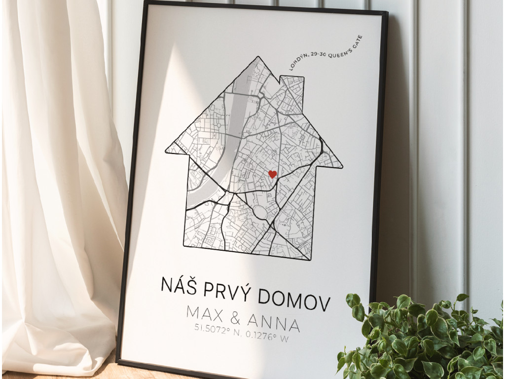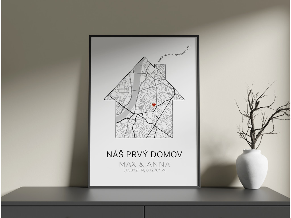 Obraz s mapou v tvare domčeka, ktorý zachytáva vaše jedinečné miesto. Môžete si upraviť adresu, mená, súradnice aj vlastný text, aby presne vystihoval váš domov alebo špeciálny moment. Skvelý darček pre partnera, novomanželov či ako originálna dekorácia do vlastného bývania.