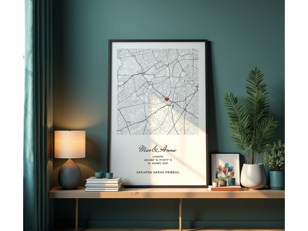 Obraz s mapou, na ktorej je srdiečkom vyznačené vaše výnimočné miesto. Doplníte si vlastné mená, polohu, dátum aj osobný text, aby mapový obraz presne vystihoval váš moment. Ideálny ako darček pre partnerov, novomanželov, na výročie, zásnuby či iný spoločný okamih.