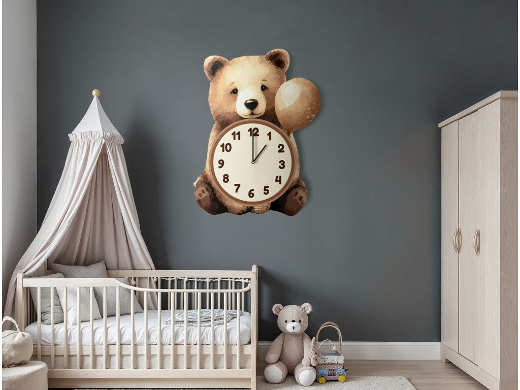 Nástenné hodiny s mackom sme navrhli pre deti s dôrazom na jednoduchý a veselý dizajn. Samozrejmosťou je tichý chod hodín, ktorý nenaruší spánok dieťaťa.