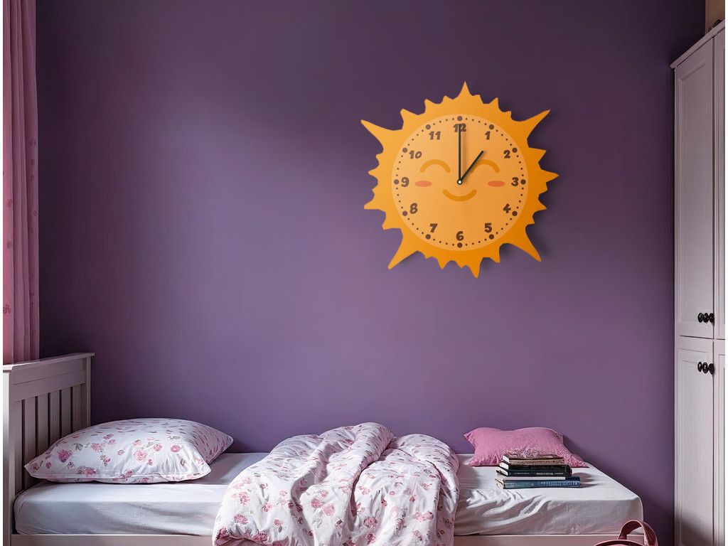 Milé detské nástenné hodiny Slnko rozžiaria izbu príjemnou a veselou atmosférou. Do hodín montujeme motorček s tichým chodom, ktorý zabezpečí pokojný spánok bez rušivého tikania.