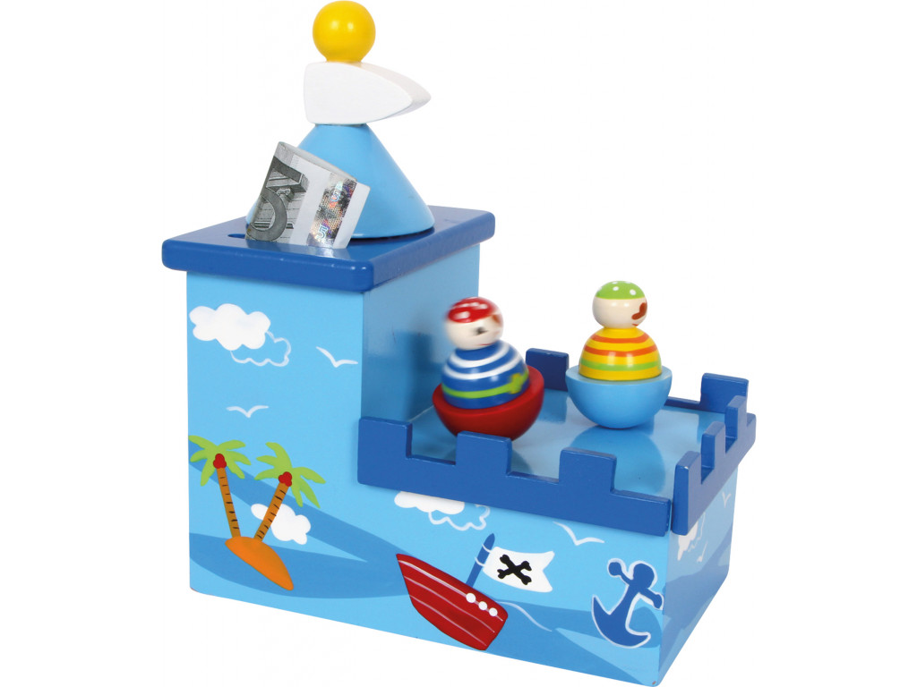 Drevená hracia skrinka s pirátskym dizajnom je zároveň pokladničkou, ktorá vykúzli úsmev na tvári malých námorníkov. Po vložení pokladu dovnútra sa postavičky roztancujú na známu melódiu. Materiál je príjemný na dotyk a hračka má zaoblené hrany pre väčšiu bezpečnosť detí. Kvalitný materiál a modré farby, vďaka ktorým sa bude hodiť do každej chlapčenskej izbičky.