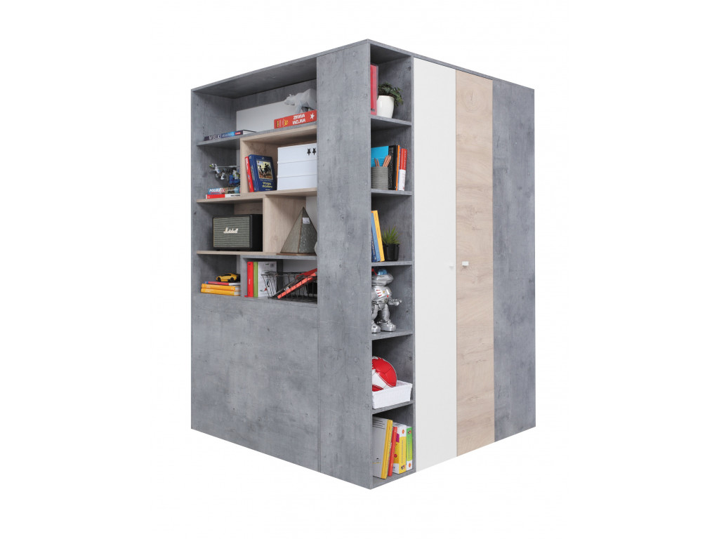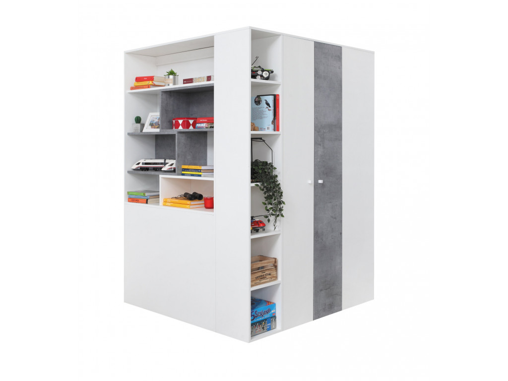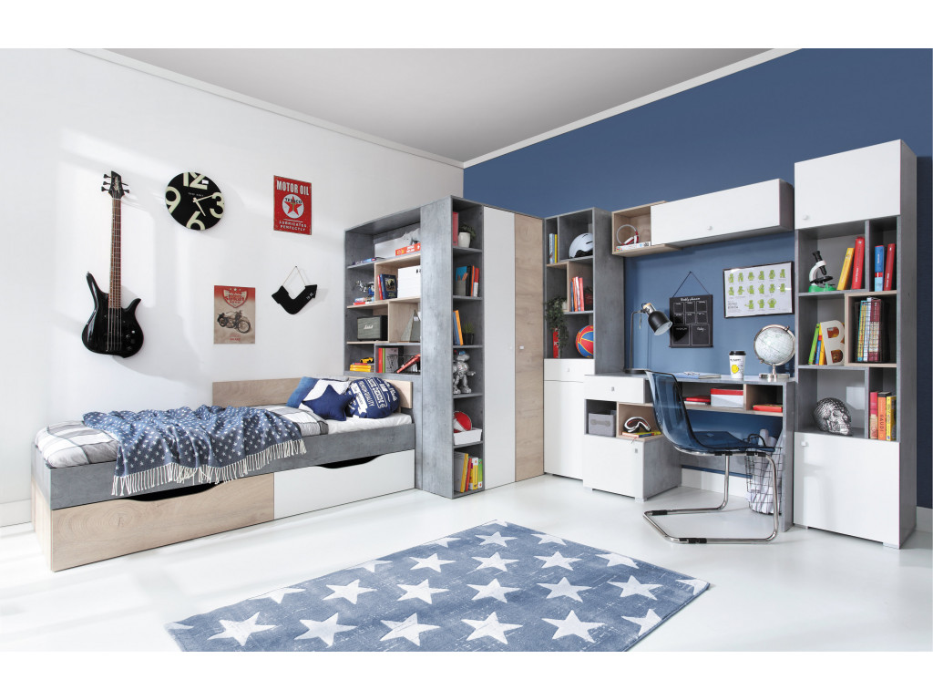 Detská izba sa vďaka regálom a najmä rohovej skrini (skriňa disponuje vonkajším otvoreným úložným priestorom v podobe 13 políc, po otvorení dverí nájdete ďalšie priestory - police, zásuvky i závesnú tyč) postará o nadštandardný úložný priestor, ale nič sa jej nedá vytknúť ani pri pri písacom stole či posteli. Písací stôl disponuje dostatočnou pracovnou plochou na písanie domácich úloh alebo na umiestnenie počítača či notebooku, posteľ je vybavená 2 zásuvkami, pasuje do nej matrac s rozmermi 200 x 90 cm.
