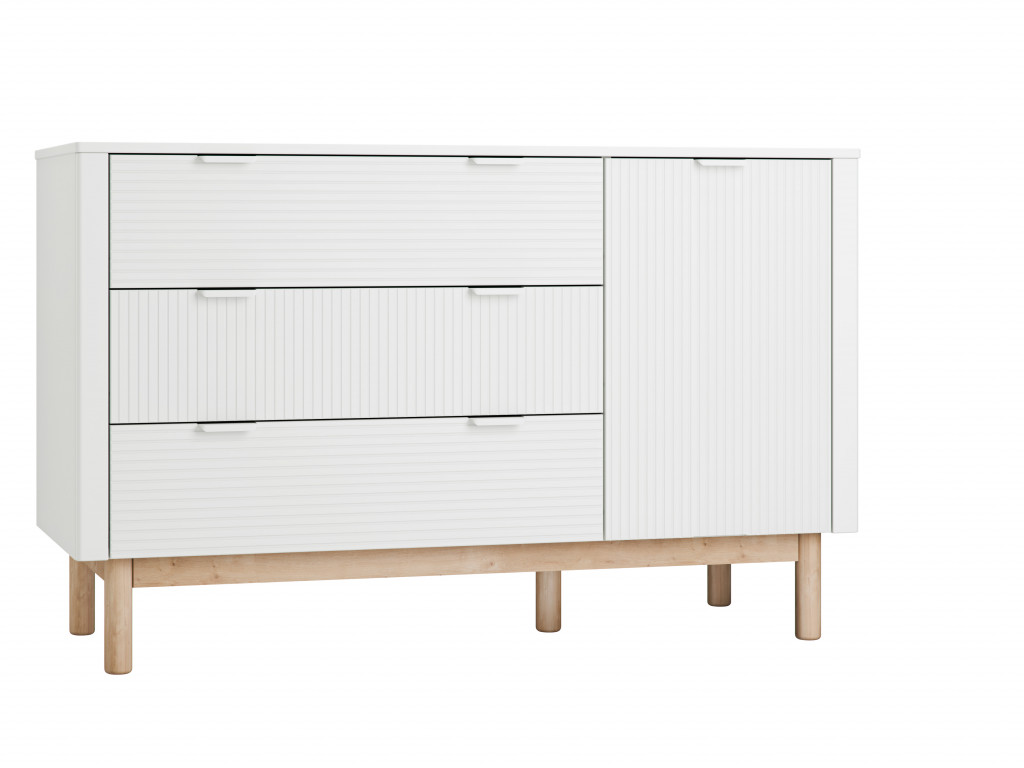 Biela detská komoda na nožičkách z kolekcie Miloo dodá detskej izbe ten správny štýl. Komody sú nepostrádateľnou súčasťou detskej izby, pričom komoda Miloo s 3 zásuvkami a 1 dvierkami nezaberie veľa miesta a disponuje veľkým úložným priestorom.