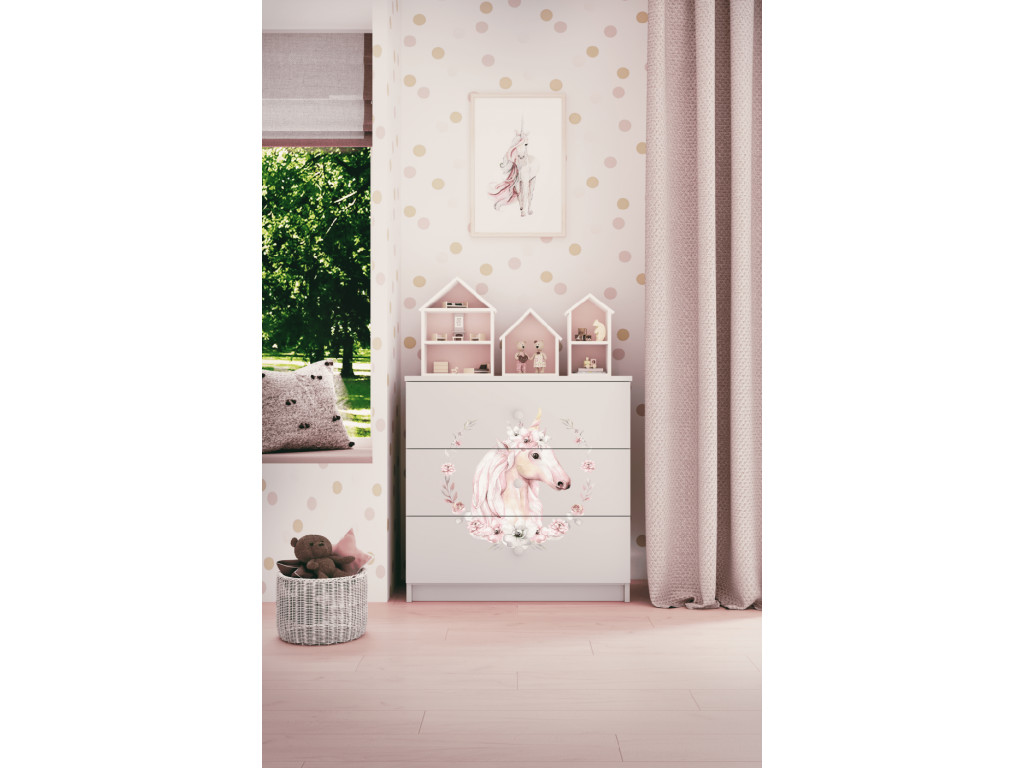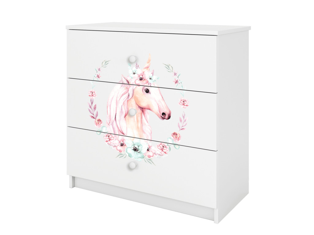 Dodajte detskej izbe kúzlo s detskou komodou Jednorožec (biela)! Motív jednorožca rozžiari priestor a dodá mu nádych rozprávkového sveta, ktorý poteší každé dievčatko. Tri priestranné zásuvky ponúkajú praktické riešenie na organizáciu oblečenia, hračiek či doplnkov, pričom jednoduchý biely dizajn zaručuje univerzálnosť a ľahké zladenie s ďalším nábytkom.