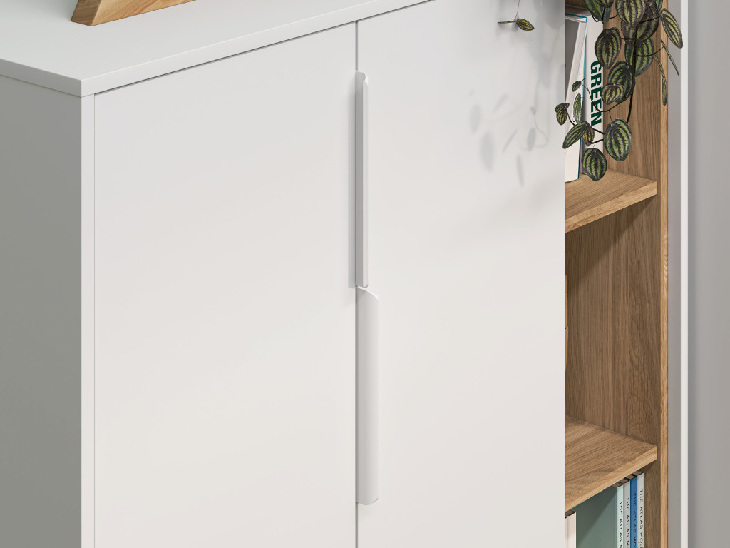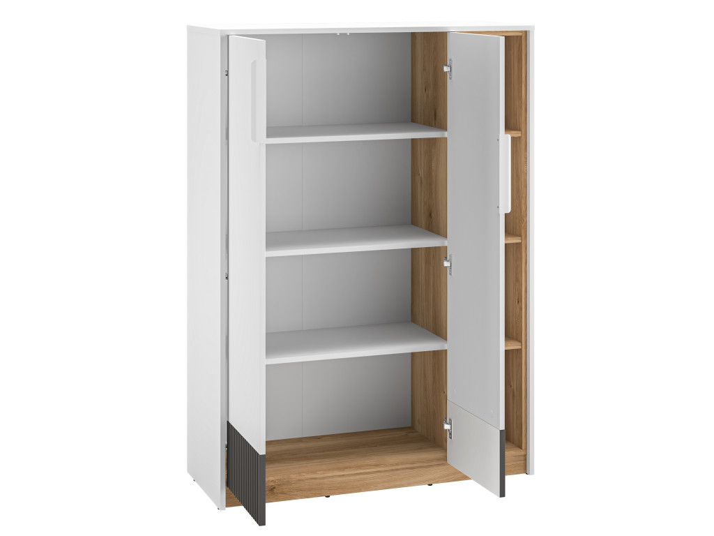 Vysoká detská komoda Torino 05 kombinuje dvojdverový úložný priestor s praktickými policami za dverami a otvoreným regálom, ideálnym na vystavenie kníh či dekorácií.