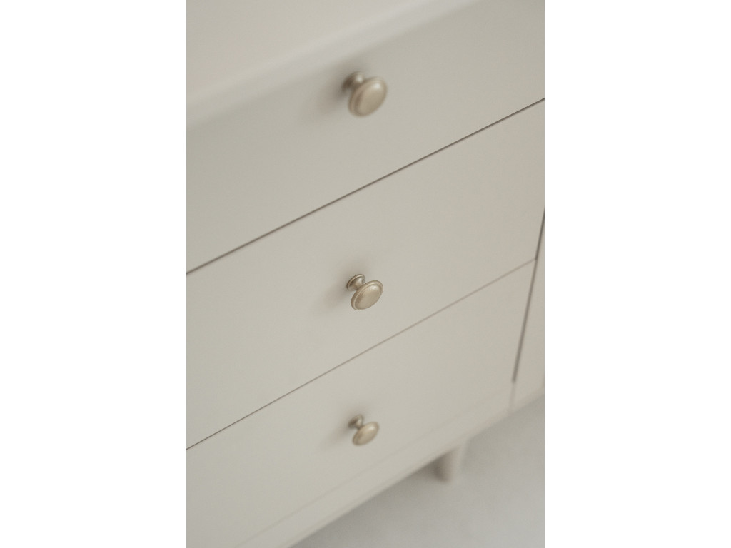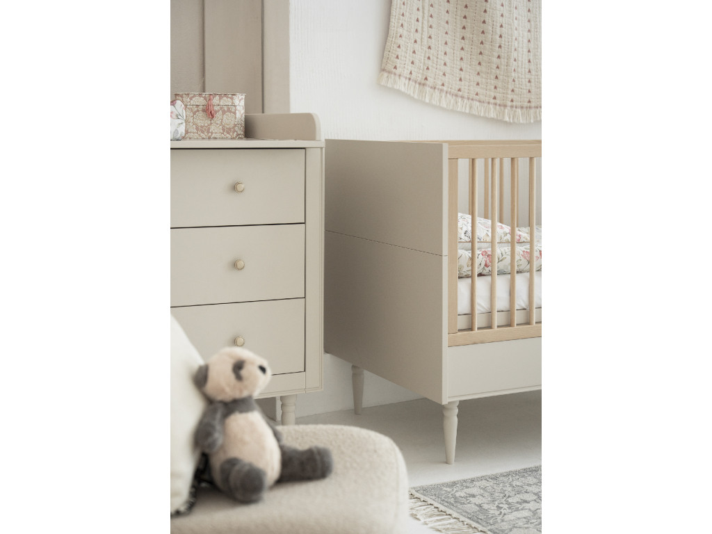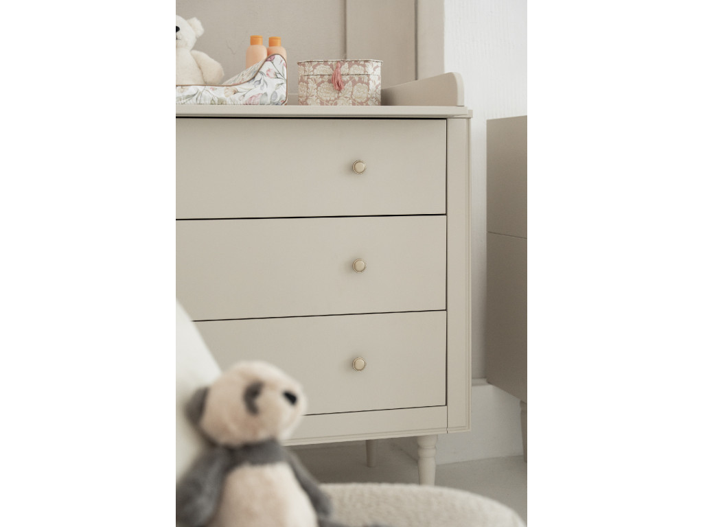 Komoda Petite v béžovej farbe so zlatými guľatými úchytkami je elegantný a praktický kúsok nábytku, ktorý skvelo doplní výbavu izbičky pre bábätko alebo dieťa. Tri priestranné zásuvky ponúkajú dostatok miesta na oblečenie, doplnky či hračky, pričom vďaka tichému dovieraniu je jej používanie maximálne pohodlné a bezpečné. Kombinácia jemného odtieňa pôsobí útulne a zároveň moderne. Kvalitné materiály a premyslený dizajn zaručujú, že komoda bude spoľahlivým pomocníkom počas celého detstva.