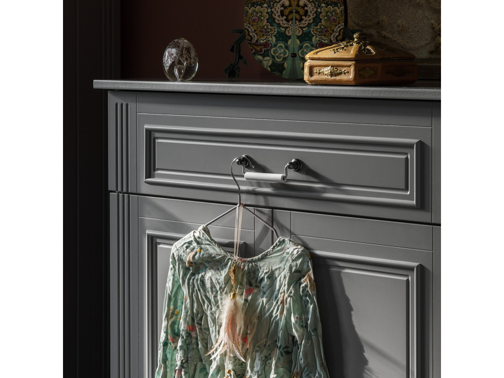 - Čelá zásuviek, boky, doska, podnože sú vyrobené z MDF lakovanej v elegantnej bielej alebo neutrálnej šedej.