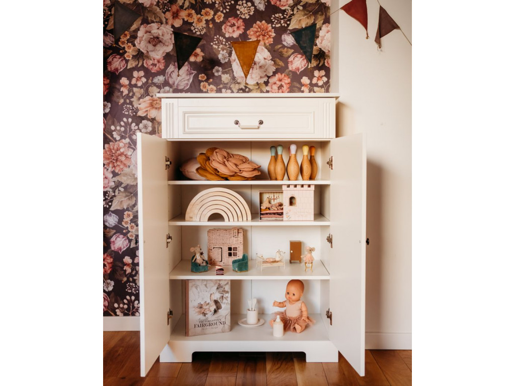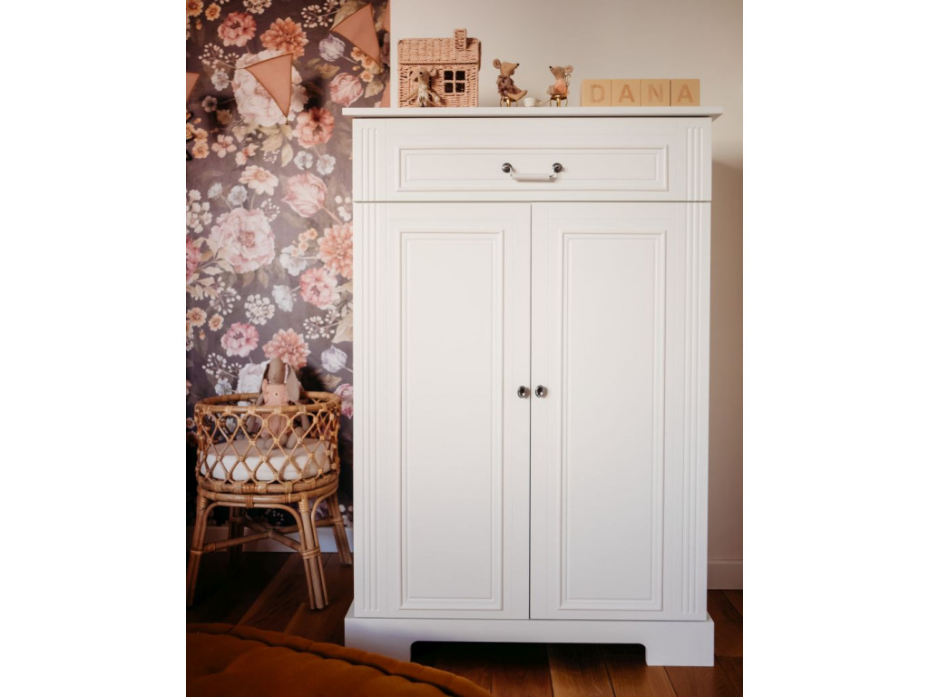 Jednoduchá elegantná komoda do detskej izby Ines so zásuvkou poskytne dostatok miesta pre oblečenie a hračky. Po otvorení dvierok na vás čakajú priestranné 4 police. Vybrať si môžete z neutrálnej bielej a sivej farby, ktorá rozjasní interiér. Komoda je vyrobená z materiálov bezpečných pre deti a odolných voči poškodeniu.