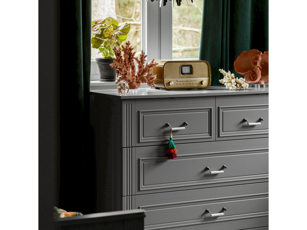 - čelá zásuviek, boky, vrch a podstavce komody sú vyrobené z MDF dosky s bielym alebo sivým náterom,