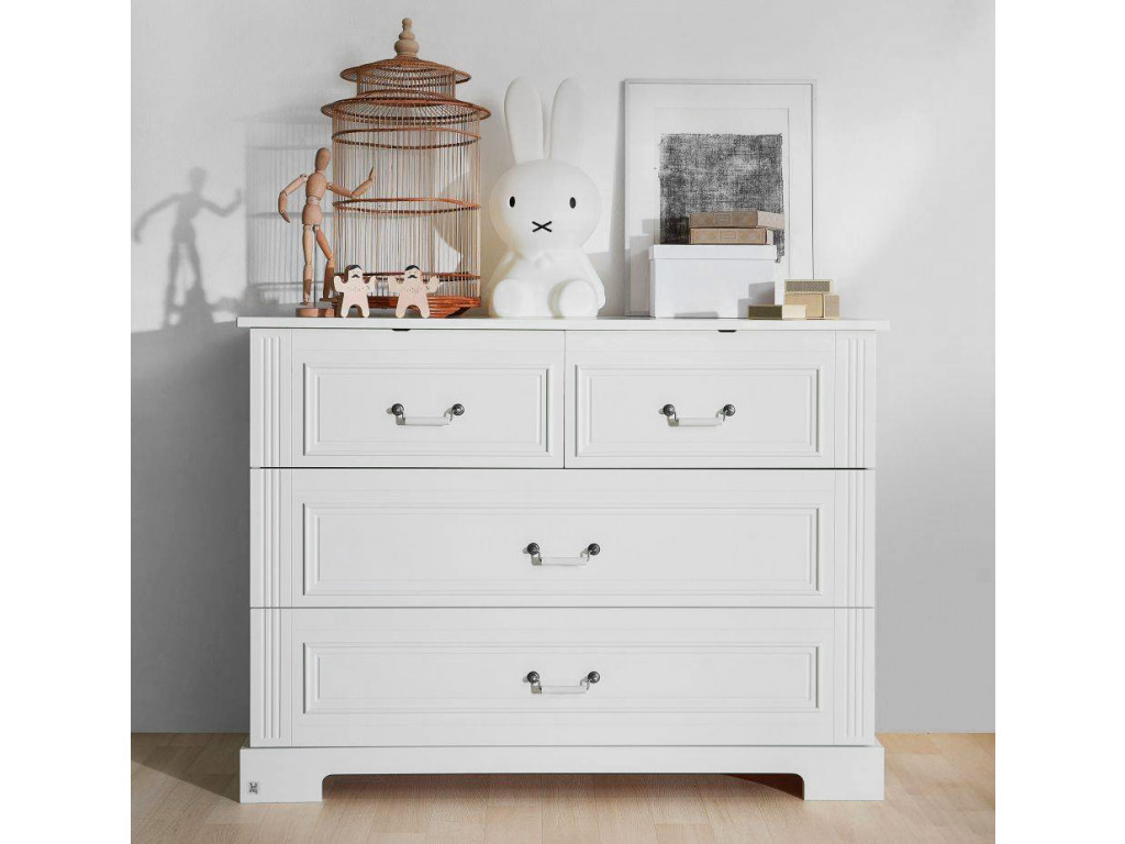 Komoda Ines so 4 zásuvkami ponúka kombináciu elegantného dizajnu s maximálnou funkčnosťou. Vďaka širokým a hlbokým zásuvkám nebude ukladanie detského oblečenia alebo doplnkov nikdy jednoduchšie.