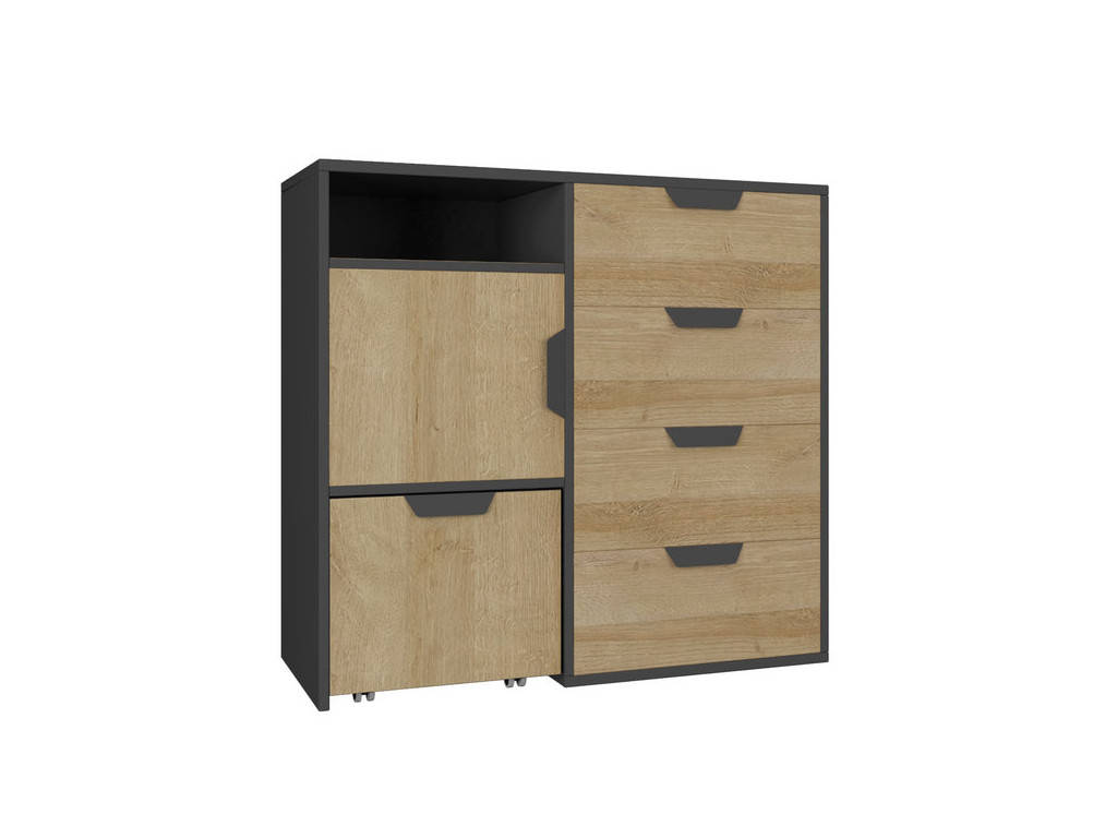Dostatok úložného miesta na odloženie oblečenia, odevných doplnkov alebo rôznych praktických vecičiek príde vždy vhod. Bez ohľadu na to či vlastníte priestrannú vilu alebo menší byt, pri zariaďovaní interiéru rozhodne nemôžu ostať bez povšimnutia komody, ktoré prispejú k udržaniu poriadku v akejkoľvek miestnosti. Vrátane obývačky alebo študentskej či detskej izby. Komoda Nano NA8 samozrejme nie je výnimkou. Vďaka 4 zásuvkám, skrinke s dvierkami, výsuvnému kontajneru na kolieskach a otvorenej poličke bude uloženie oblečenia, odevných doplnkov a rôznych predmetov jednoduchou záležitosťou.