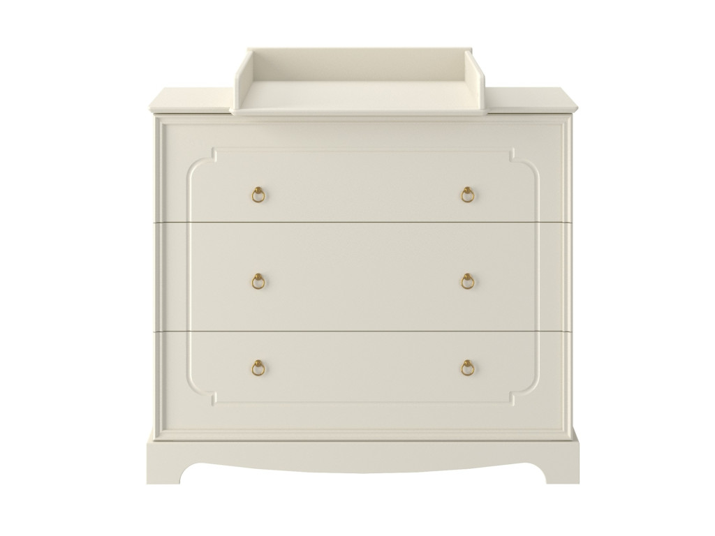 Komoda Royal v odtieni krémová latte je praktickým a elegantným doplnkom každej detskej izby. Poskytuje dostatok úložného priestoru na oblečenie, hračky či posteľnú bielizeň, takže pomáha udržiavať v izbe poriadok a prehľad. Je vyrobená z bezpečných, zdravotne nezávadných materiálov a upravená lakmi vhodnými pre deti. Zlaté úchytky v tvare krúžka pridávajú komode jemný, noblesný charakter, ktorý krásne vynikne v kombinácii s odtieňom krémovej latte.