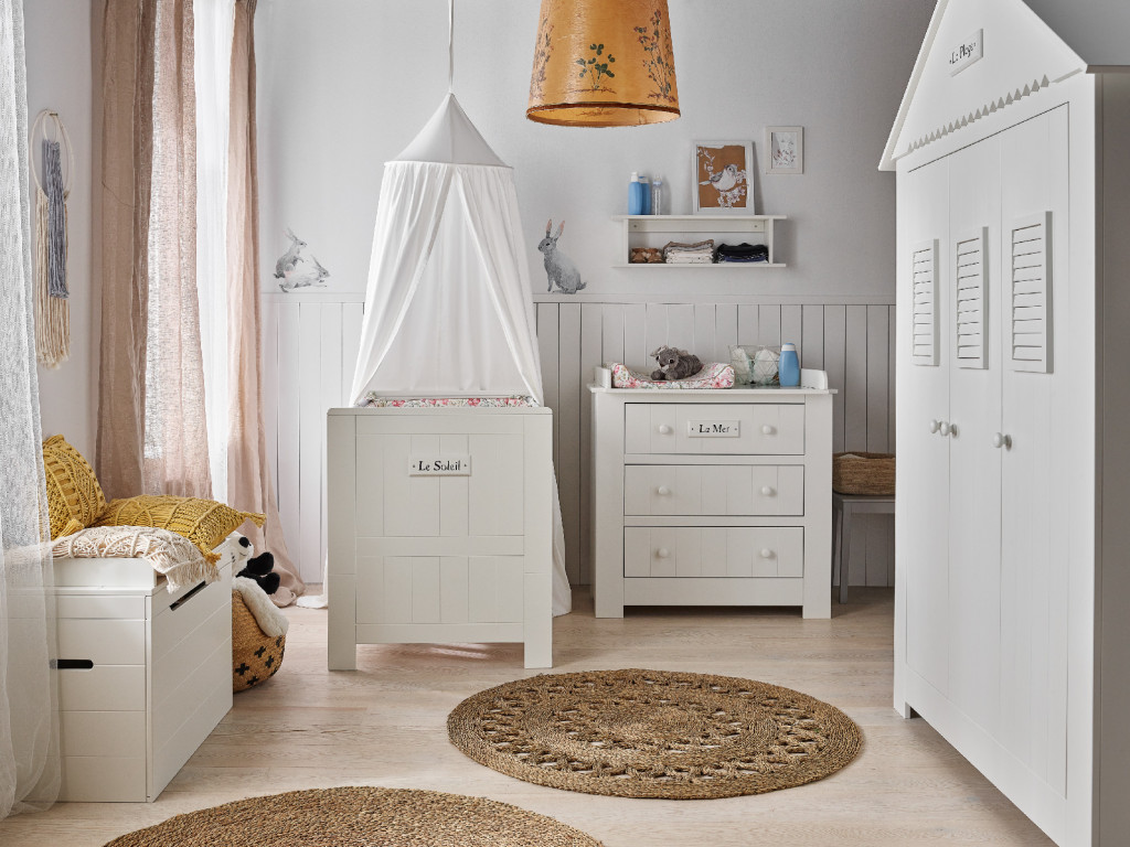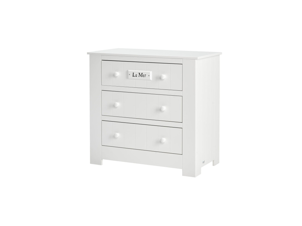 Komoda má dekor La Mer (francúzsky: more). K dispozícii je v bielej farbe. Hodí sa preto do chlapčenskej aj dievčenskej izby. Produkt dodávaný v balení na samomontáž.