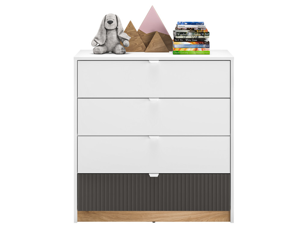 Zásuvková komoda Torino 07 prináša do detskej izby praktickosť a moderný dizajn. Štyri priestranné zásuvky ponúkajú množstvo úložného priestoru na oblečenie, hračky či školské potreby, pričom kombinácia matnej bielej, dubu castello a grafitového lamelového pásu vytvára atraktívny vzhľad. Táto komoda pridáva izbe štýl a zároveň udržiava všetky veci prehľadne uložené.