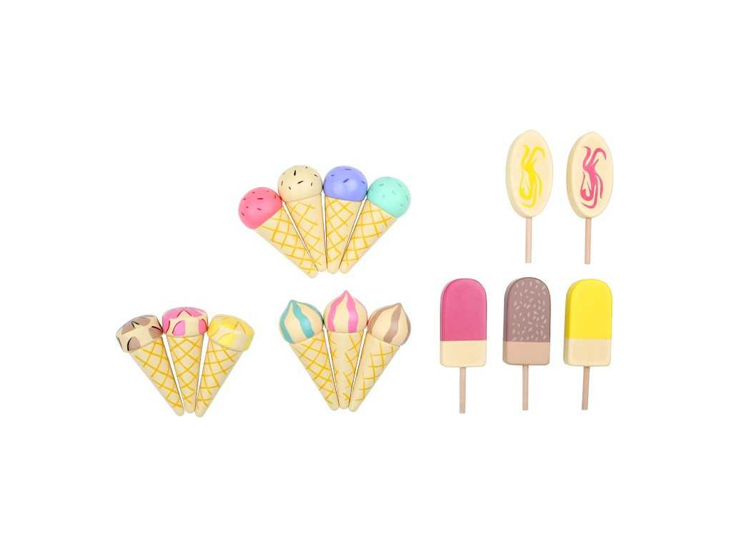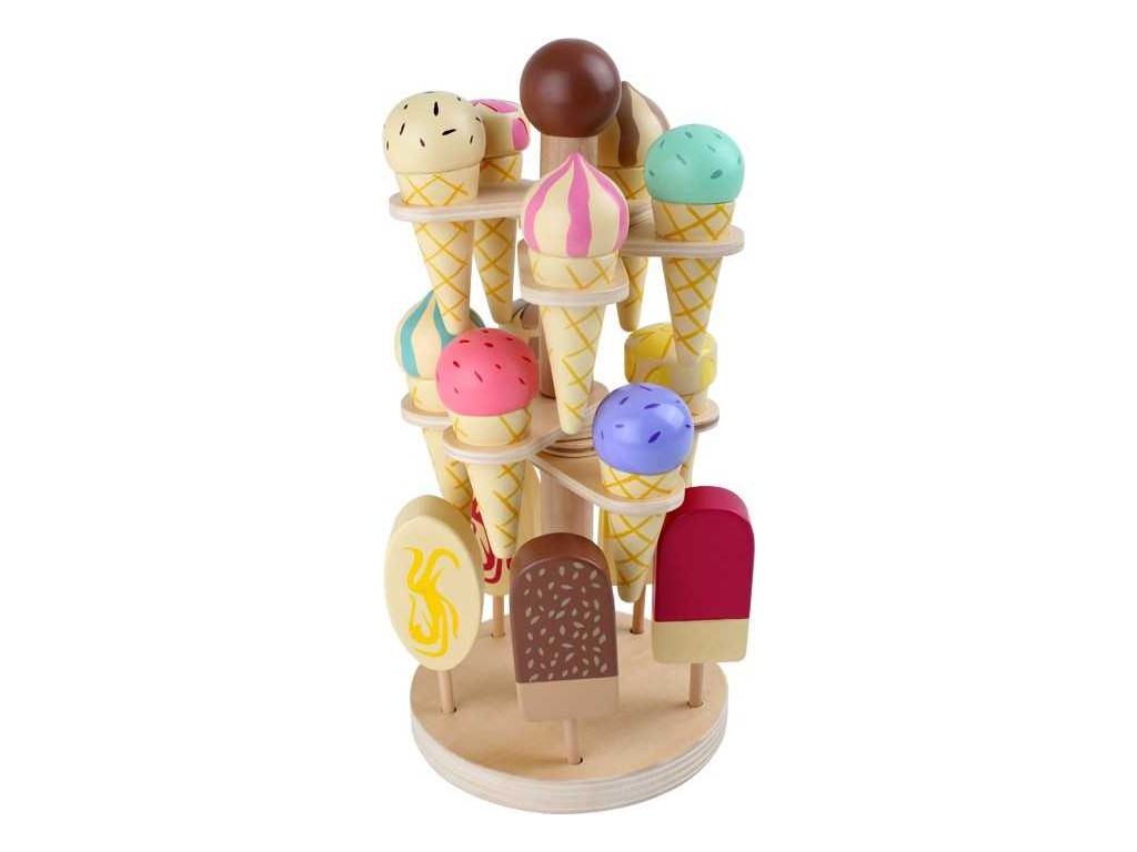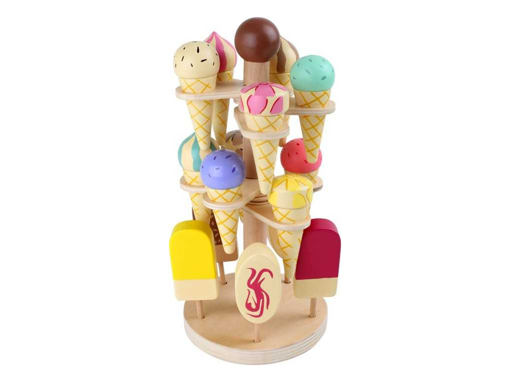 Súprava mrazených dobrôt z dreva v pohyblivom stojane ponúka pestrú ponuku zmrzlín v kornútku a nanukov na paličkách. Takto vystavené lahôdky sa hodia do predajných stánkov, ale aj k hrám na cukráreň. Svieže letné dobroty si tak môžete užívať po celý rok.