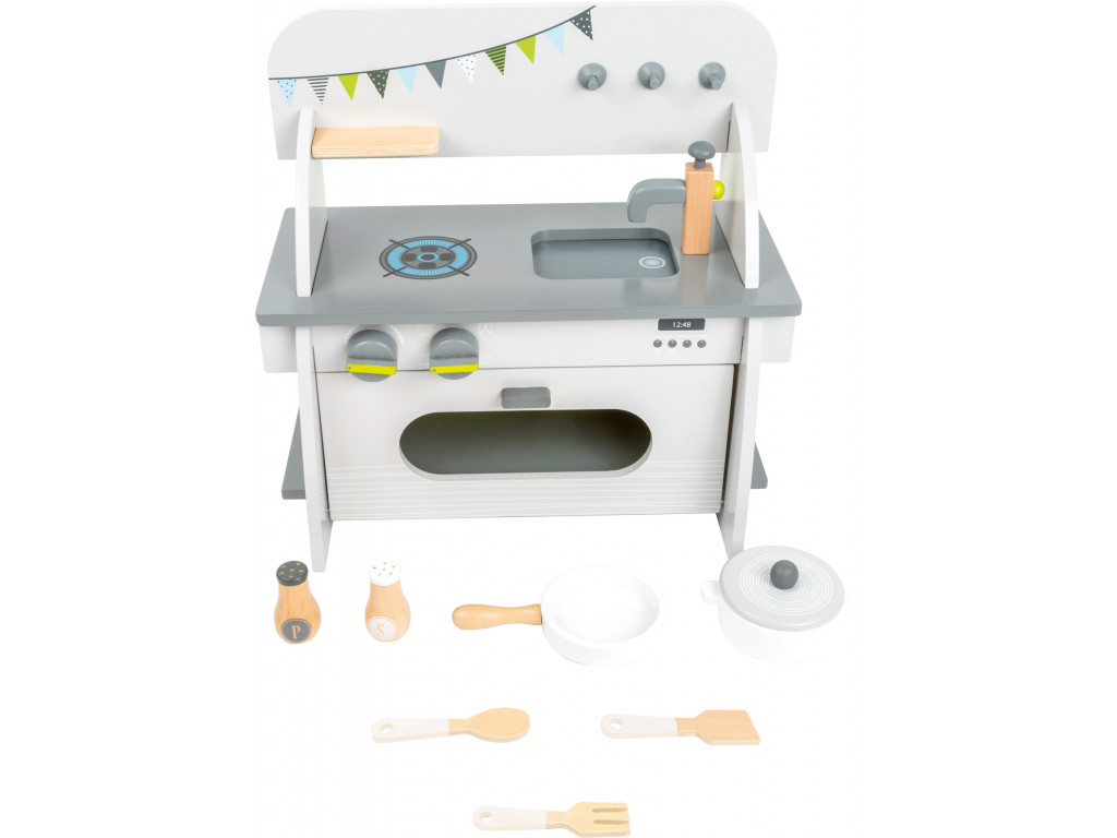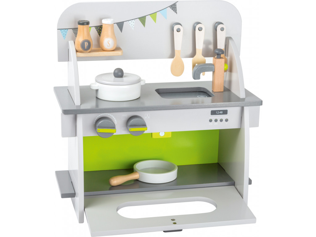 Kompletne vybavená drevená kuchynka Compact má všetko, čo malí kuchári potrebujú na prípravu obeda pre svojich kamarátov. Rúra je vybavená otváracími dvierkami. Obsahuje hrniec s pokrievkou, soľničku, koreničku a iné príslušenstvo. Túto kuchynku môžete zostaviť a rozobrať aj bez použitia náradia.