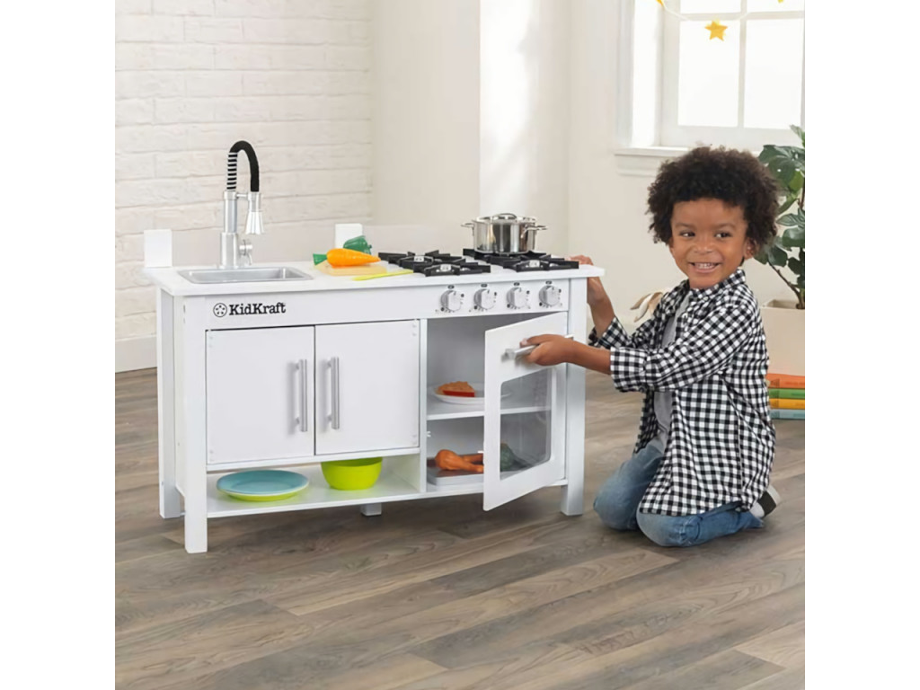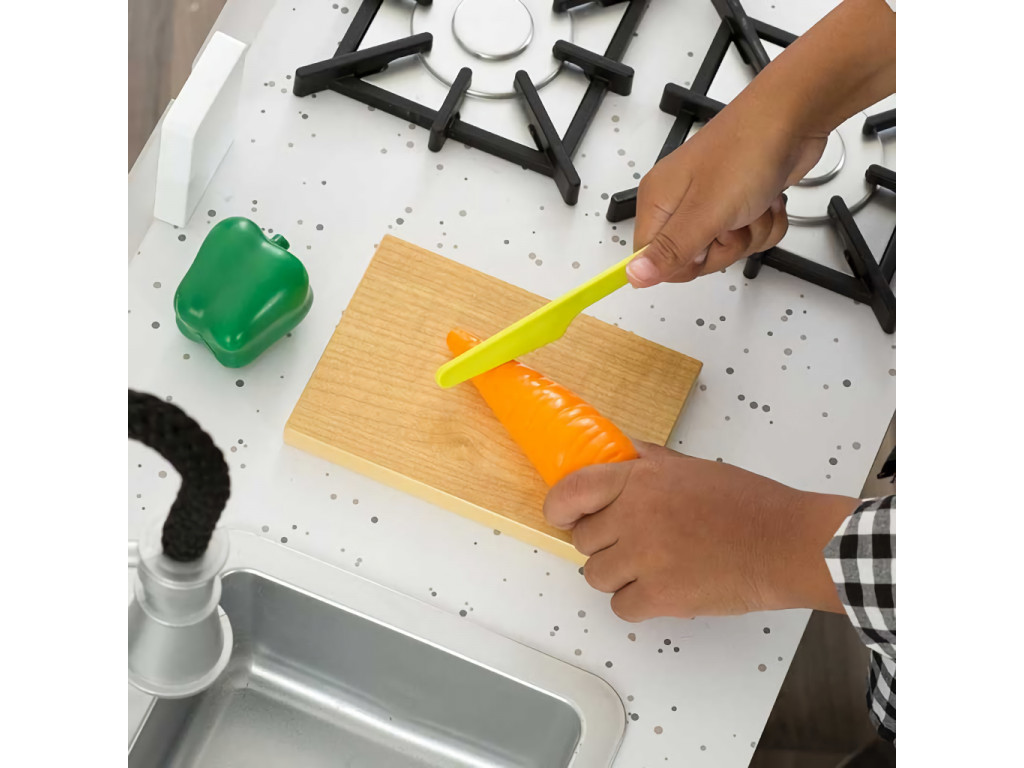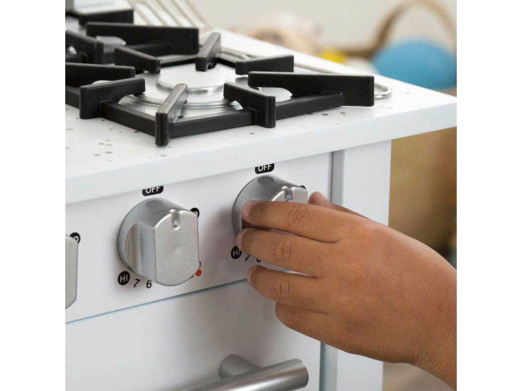 Varte ako profesionáli, čisto a s eleganciou. Vo výbave tejto modernej kuchynky nájdete drez s užitočnou sprchou na flexibilnom ramene, veľký multifunkčný sporák so štyrmi horákmi, rozmerný úložný priestor opatrený modernými dvierkami a roztomilú doštičku na krájanie. Dvierka rúry sú vybavené vitrínou, ktorou môžete nazerať na pripravované jedlá. Otáčanie gombíkov obsluhy sporáka sprevádzajú cvakavé zvuky poskytujúce odozvu. Interaktívne prvky dodávajú hrám na uveriteľnosti. Výrobok vyžaduje montáž, dodávané s detailným návodom na zostavenie.