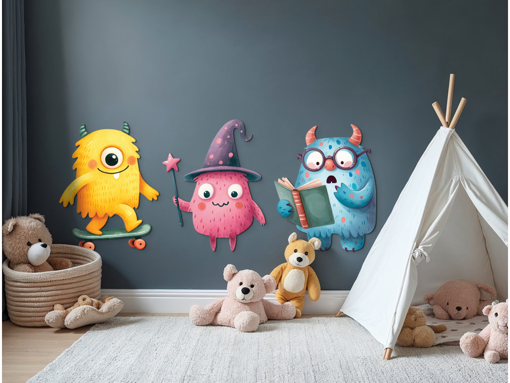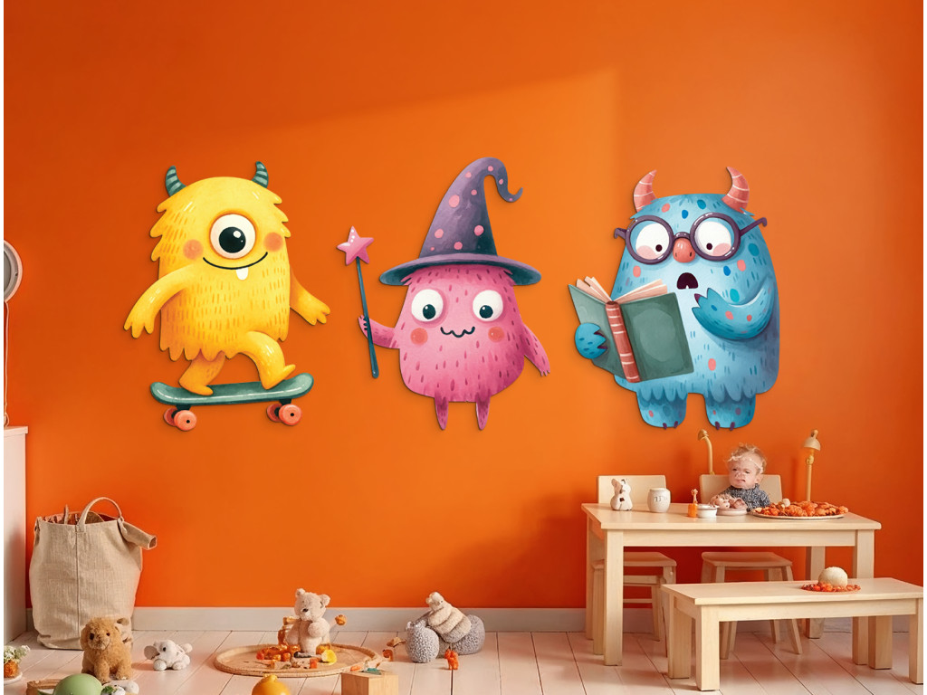 Táto trojdielna sada detských obrazov prináša do izby hravú dávku zábavy a fantázie. Farebné strašidlá rôznych tvarov nie sú vôbec strašidelné – skôr milé, veselé a plné charakteru. Ideálne pre deti, ktoré majú rady vtipné príšerky a veselý dizajn.