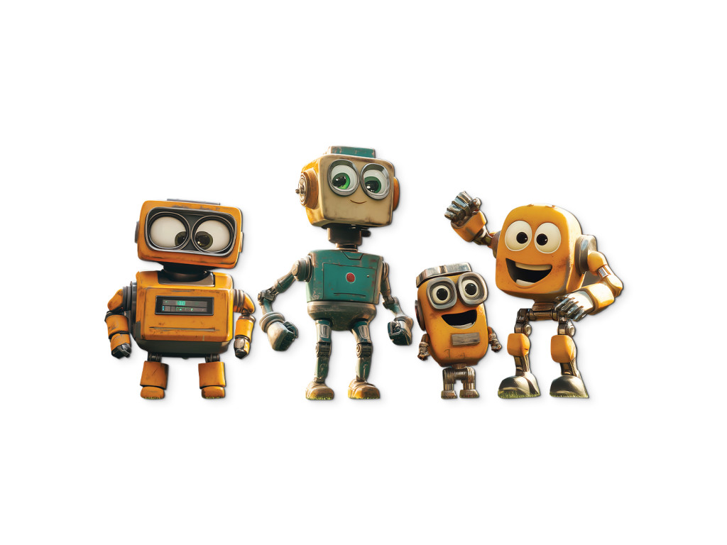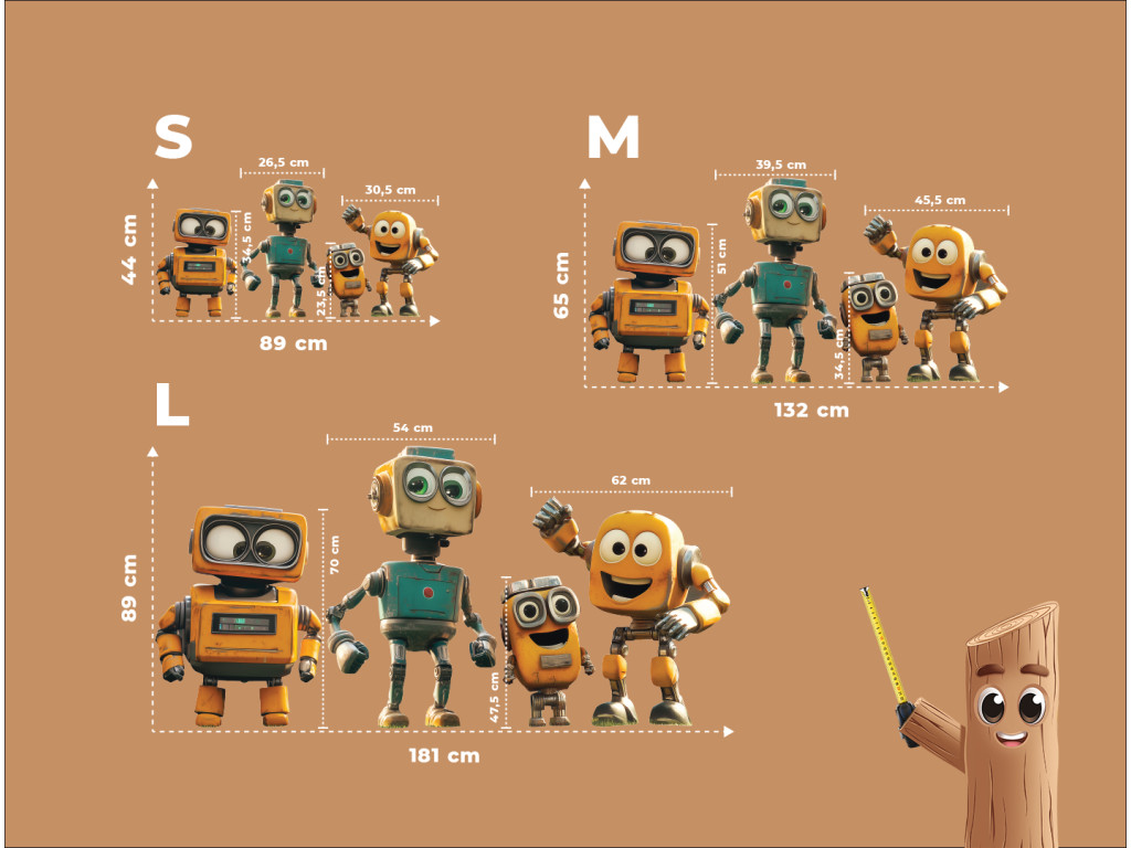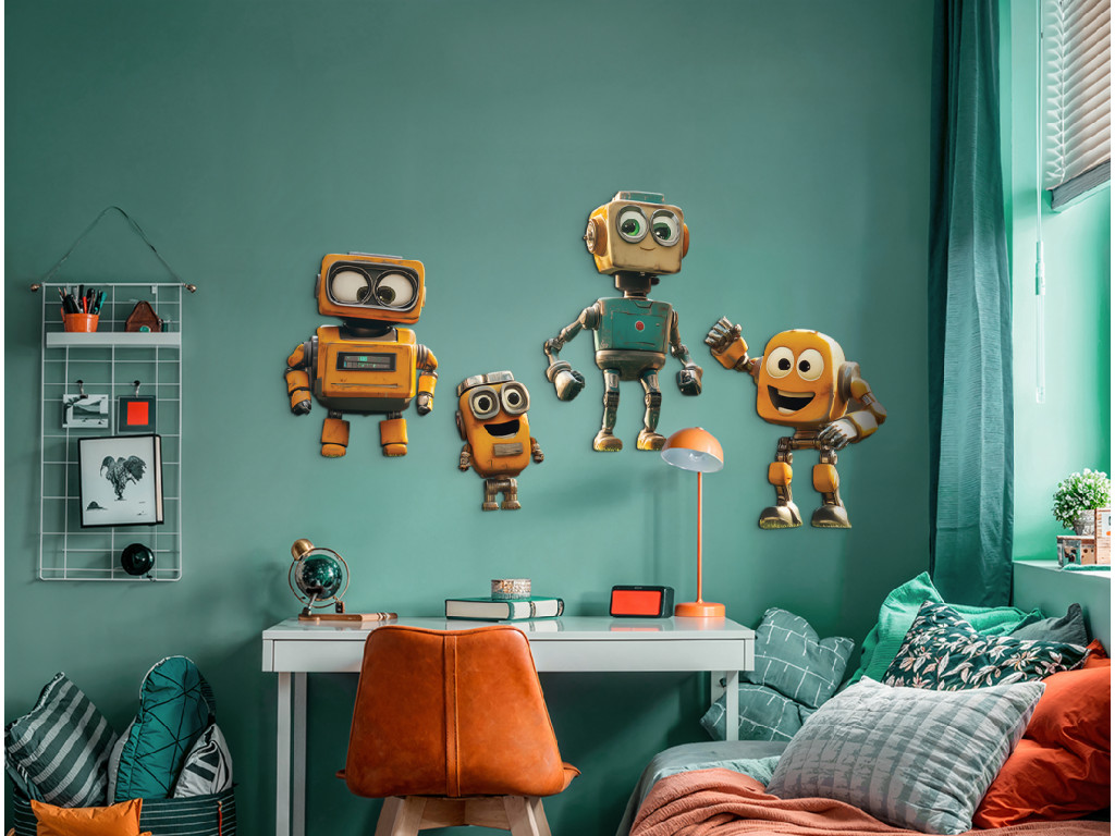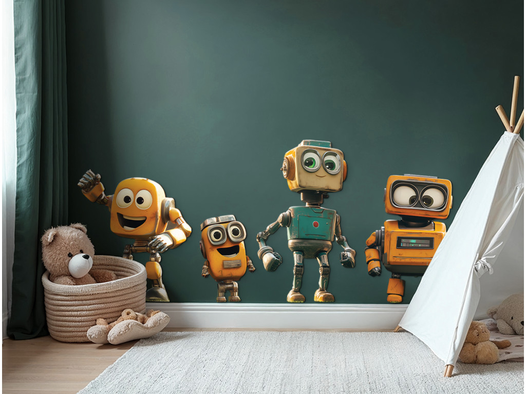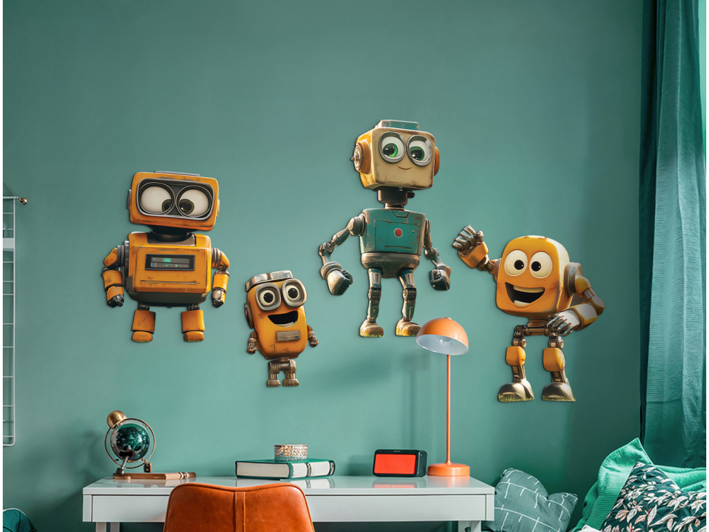 Táto hravá nástenná dekorácia zobrazuje skupinu štyroch animovaných robotov, ktorí pôsobia ako skutoční kamaráti. Farebné postavičky s výraznými tvárami a rôznorodým dizajnom podporujú detskú predstavivosť a zvedavosť. Dekorácia je ideálna pre milovníkov techniky, sci-fi a robotických dobrodružstiev.